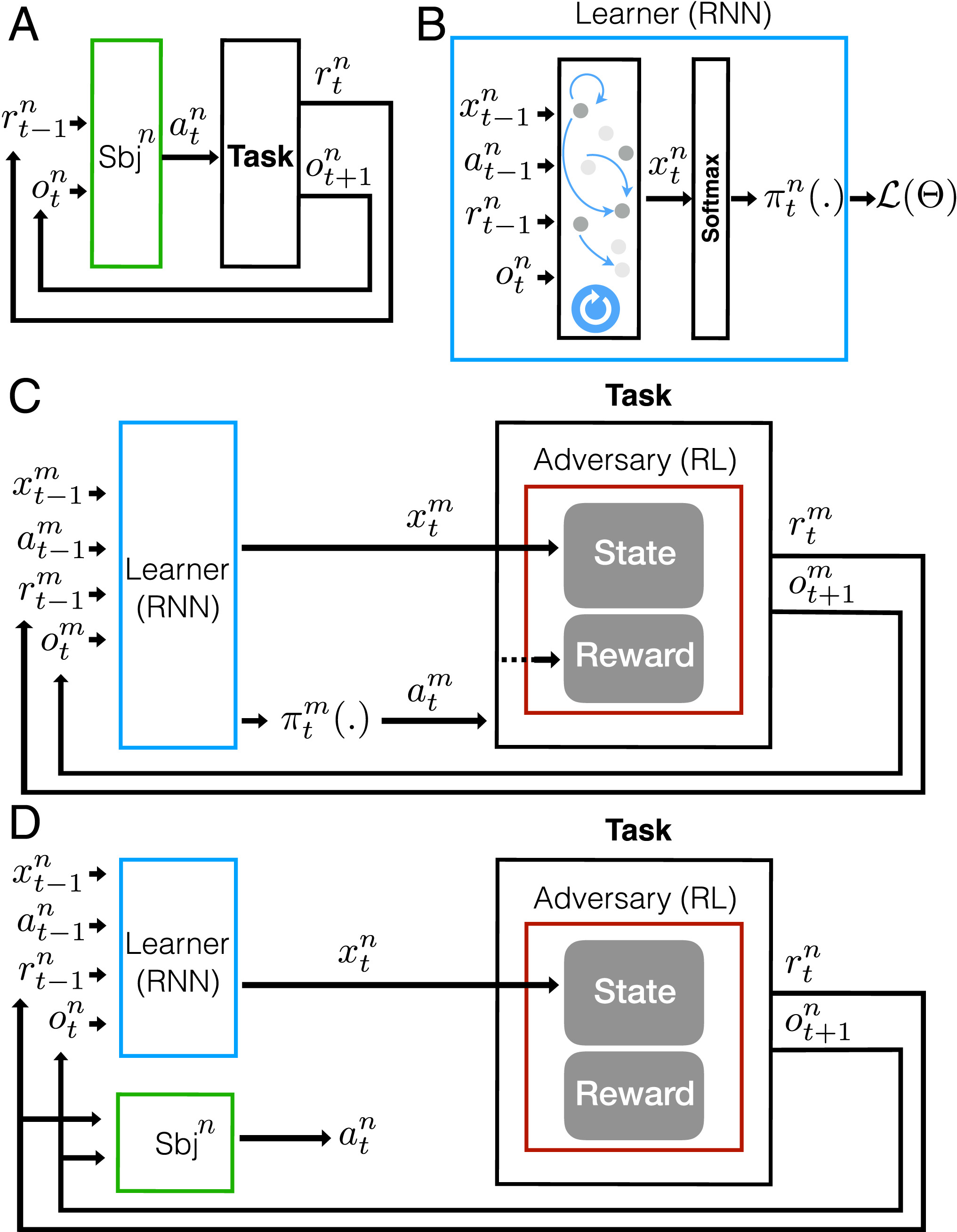 적대적 학습자는 강화학습(RL) 기반의 에이전트(agent)로 설계되었으며, 피험자가 받는 보상(learner reward)과 관측값(observation)을 조작하여 목표 행동을 유도하는 것이 목표이다. 적대적 모델은 단순히 개별 시행의 행동을 조작하는 것이 아니라, 연속된 시행(trial) 동안 피험자의 행동을 특정한 패턴으로 유도하는 전략을 학습한다. 순차적 의사결정 문제(sequential decision-making problem)로 모델링되며, 이는 강화학습(RL)으로 해결된다.