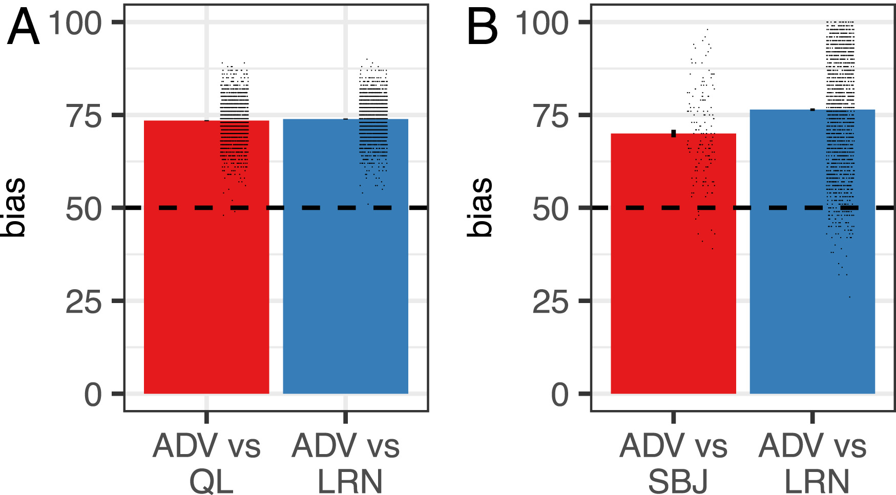 훈련된 적대적 모델을 학습자 모델(learner model)과 Q-learning 모델을 대상으로 평가하였다. 주요 종속 변수(dependent variable)는 “편향(bias)”으로, 이는 학습자/모델로부터 타겟 행동이 선택된 시행의 비율(%)을 의미한다. Q-Learning 모델을 대상으로 했을 대의 평균 편향은 73.4%으로 적대적 모델은 학습자의 선택을 타겟 행동으로 유도하는 데 성공했다. 이는 기존 연구(ref. 1)에서 얻어진 결과와 유사하지만, 본 연구에서는 Q-learning 알고리즘을 사전에 알지 못한 상태에서도 동일한 결과를 도출했다는 점에서 차별점이 있다. 학습자 모델(learner model)을 상대로 했을 때의 평균 편향은 73.8%으로, 적대적 모델은 Q-learning 모델과 학습자 모델을 상대로 유사한 수준의 편향을 유도하는 데 성공하였다. 각각의 점은 한 번의 시뮬레이션을 의미한다.