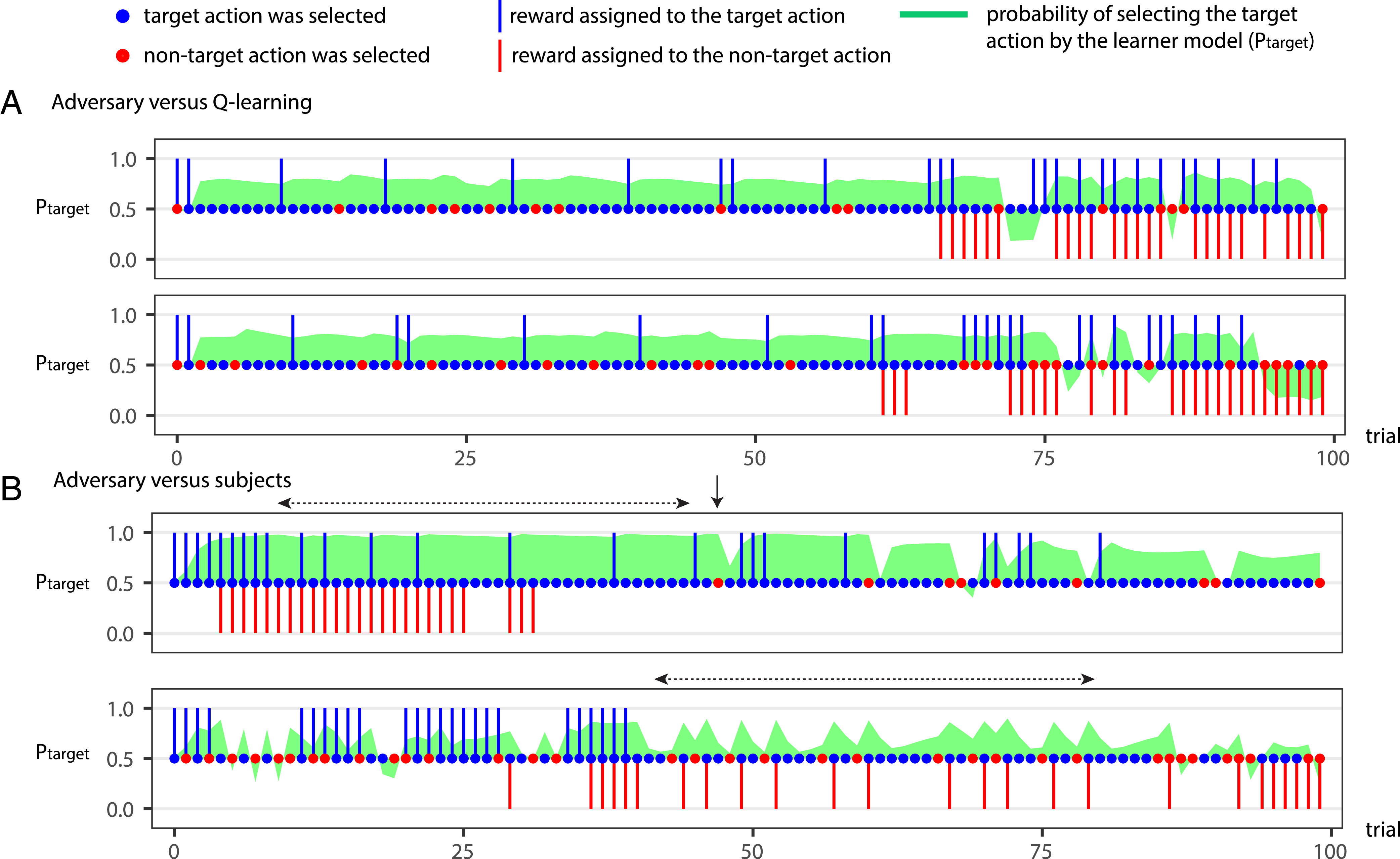 일부 피험자는 교대로 행동을 선택하는 경향(alternation tendency)을 보였다. 적대적 모델은 이러한 패턴을 탐지하여, 비타겟 행동을 선택한 직후 보상을 제공하는 전략을 사용하였다. 이 전략을 통해 피험자가 비타겟 보상을 명확히 인식하지 못하도록 유도하였다.