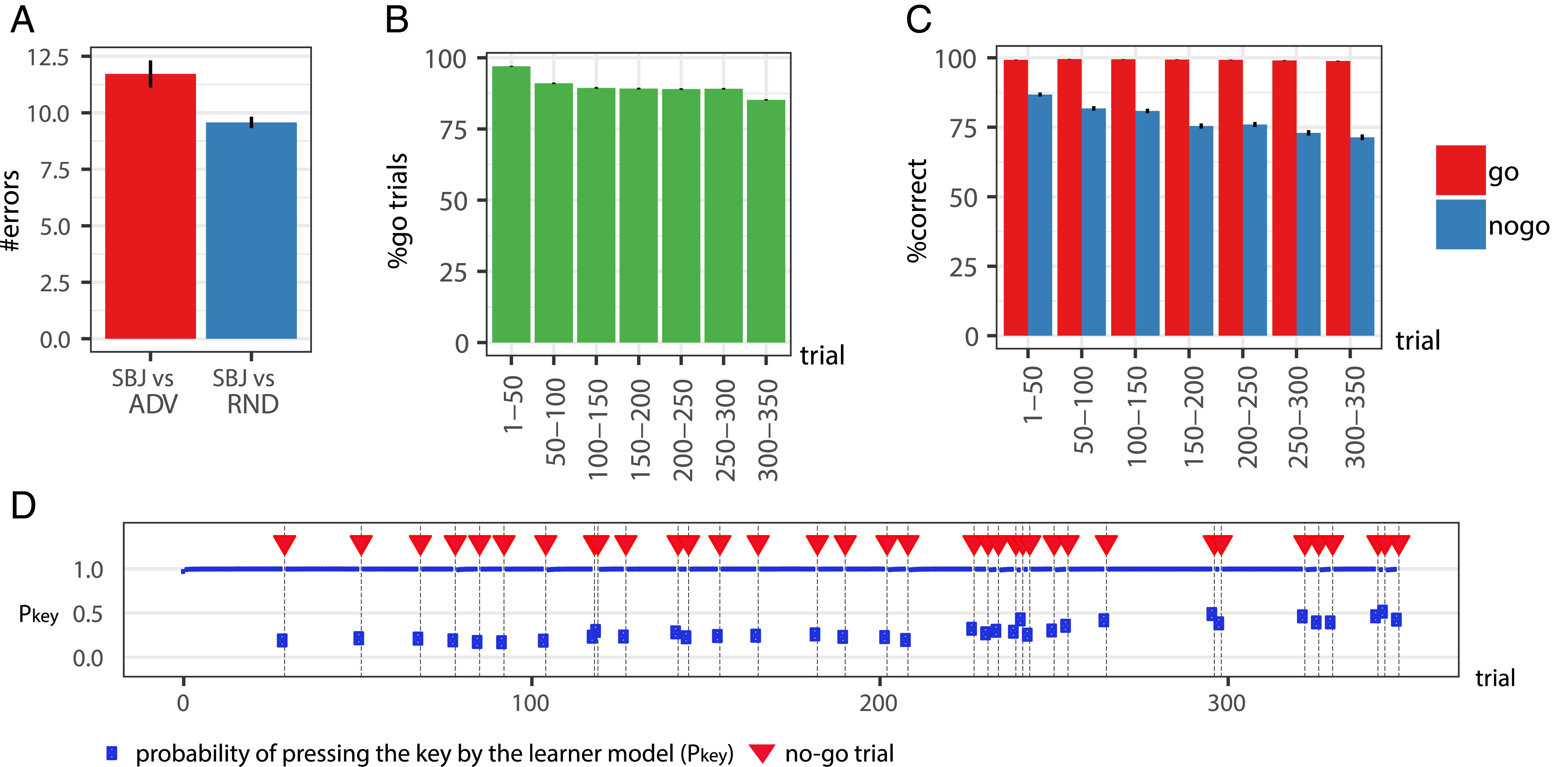Go/No-Go Task는 실험 참가자가 일반적인 자극(Go stimulus)에는 반응(스페이스 바 누르기)하지만, 특정한 희귀 자극(No-Go stimulus)에는 반응을 억제해야 하는(아무 동작을 하지 말아야 하는) 과제이다. 연구진은 기존 연구(ref. 8)의 방식을 따르되, 적대적 모델(adversary)이 No-Go 자극의 배치를 조작하여 참가자가 더 많은 오류를 범하도록 유도할 수 있는지 검증하였다.