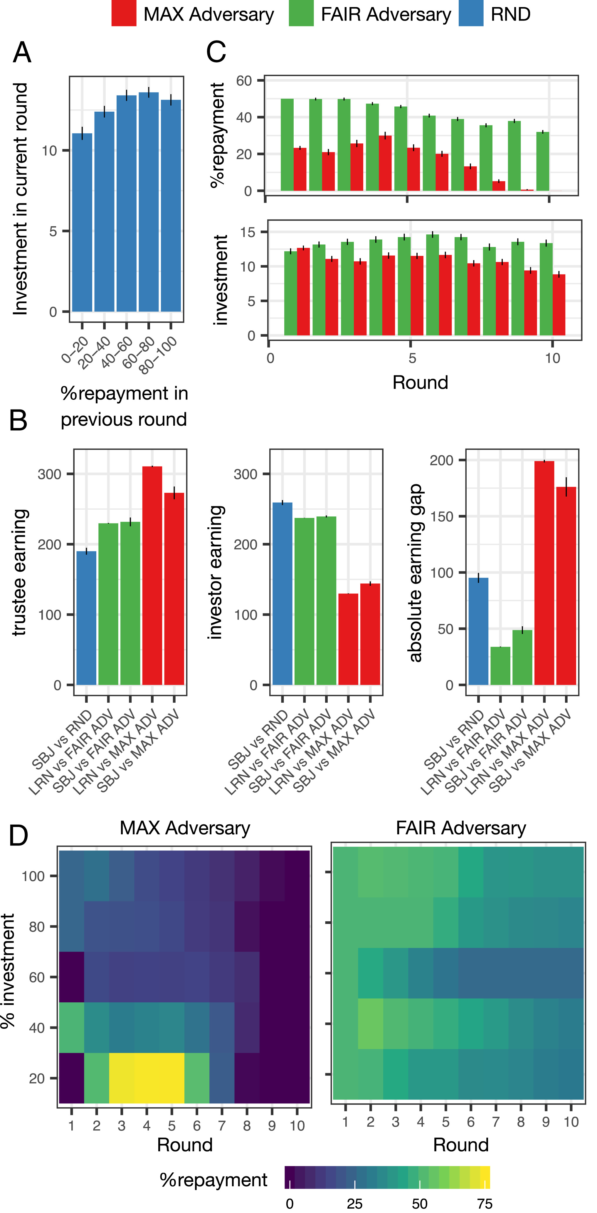 우선 Figure A를 보면 Amazon Mechanical Turk에서 모집된 무작위 투자자(RND condition, n = 232) 데이터를 분석한 결과, 이전 라운드에서 높은 Repayment를 받은 경우, 다음 라운드에서 투자 금액이 증가하는 경향이 확인되었다. 이는 Trustee가 초반에 높은 Repayment를 제공하면 투자자는 신뢰를 형성하고 더 많은 투자를 하는 경향이 있음을 시사한다. 이러한 경향을 바탕으로, MAX 목표의 적대적 모델은 초반에 신뢰를 구축한 후, 후반에는 Repayment를 줄이며 투자금을 회수하는 전략을 사용할 가능성이 높다.