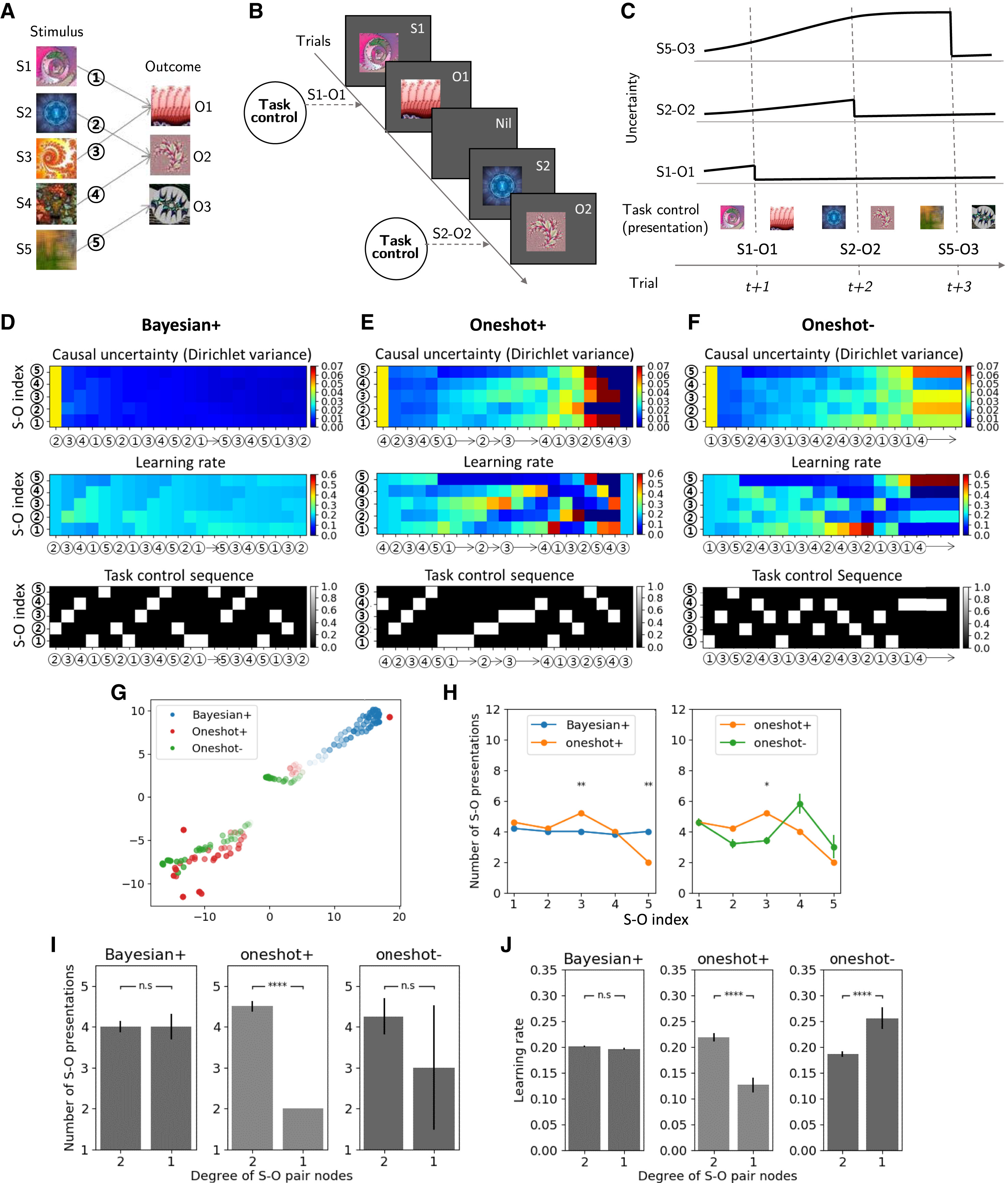 Figure 2H에서는 태스크 컨트롤 정책에 따라 S-O 페어가 제시되는 횟수에 차이가 있음을 보여준다. Oneshot+ 조건에서는 특정 S-O 페어가 더 자주 또는 덜 자주 제시되는 반면 Bayesian+ 조건에서는 모든 S-O 페어가 거의 동일한 빈도로 제시됨. 이는 단순한 우연이 아니라, 인과적 복잡성(causal complexity)과 관련된 현상이다.