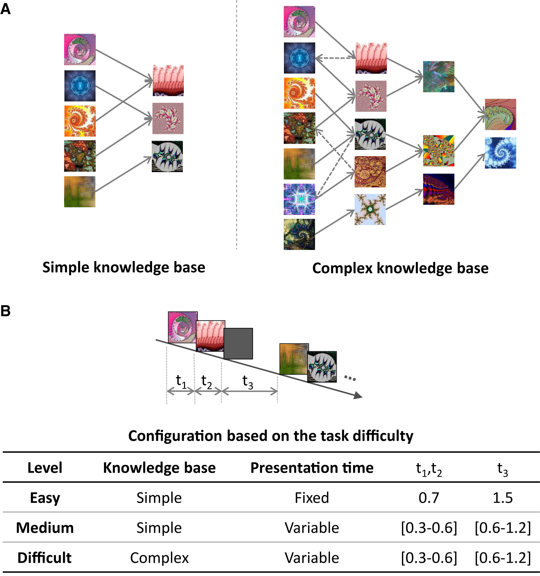 연구에서는 태스크 컨트롤러가 인간의 인과 추론을 조절할 수 있는지를 검증하기 위해, 태스크 컨트롤러를 이용하여 새로운 인과 학습 태스크를 생성하였다. 이를 위해 두 가지 유형의 지식 베이스(Knowledge Base, KB)를 이용, 실험 난이도를 조절하여 3개 난이도의 실험을 구성하였다. 자세한 실험의 구조는 이전 포스트를 참고하고, Figure 3A는 실험에서 사용한 이미지셋 베이스의 형태를 나타낸 것이다. 3B는 난이도에 따른 사용한 이미지셋, 그리고 자극을 보여준 시간이 유동적/고정인지, S-O가 보여진 시간, 간격 시간을 순서대로 나타낸 표이다.