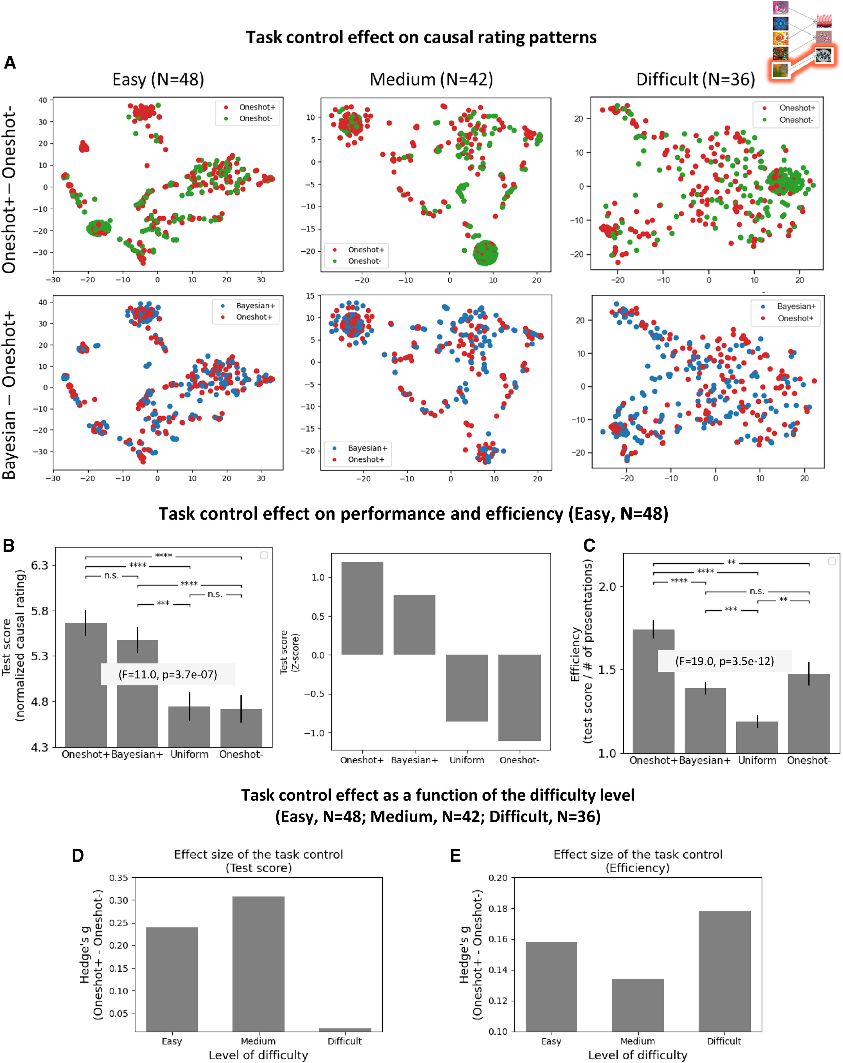 결과적으로, Oneshot+ 조건과 Oneshot– 조건 간의 인과 평가 패턴이 명확하게 구분됨을 확인하였하지만, 어려운 태스크(Difficult Task)에서는 이 효과가 덜 뚜렷하게 나타났다. Oneshot+ 및 Bayesian+ 조건은 유사한 인과 평가 패턴을 보였으며(Figures S10, S13; PCA 분석 결과), 이는 두 조건이 모두 효율적인 학습을 유도하는 역할을 했음을 시사한다.