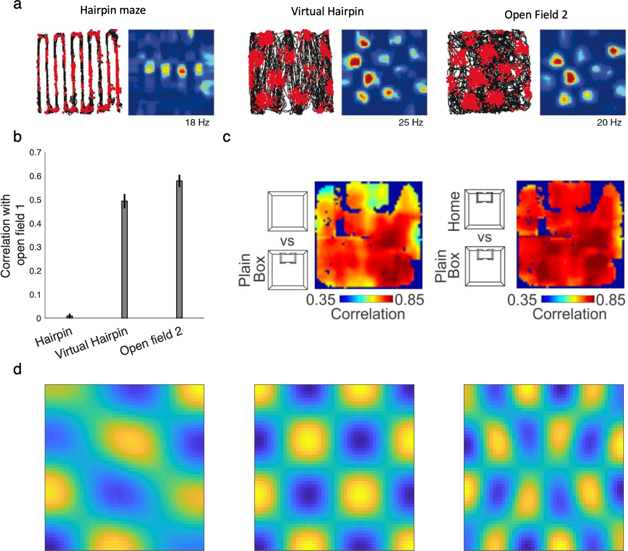 이러한 주장을 뒷받침하는 실험적 증거는 Figure 4에 제시되어 있다. Figure 4a–b에서는 벽을 세워 hairpin maze를 만들었을 때 grid field가 변화하지만, 벽 없이 동일한 행동 경로를 학습한 경우 grid field에는 변화가 없었다. 이는 정책 변화는 grid field에 영향을 주지 않으며, 오직 환경의 전이 구조(transition structure)만이 영향을 미친다는 것을 시사한다. Figure 4c는 벽의 형태가 동물의 집과 동일할 때 grid field가 반응하지만, 그것이 실제 집인지 여부는 중요하지 않다는 것을 보여주며, grid cell이 객관적인 환경 구조에 더 민감하다는 점을 강조한다. Figure 4d는 DR의 고유벡터가 2D 공간에서 주기적인 grid-like 패턴을 형성한다는 것을 시각적으로 보여준다. 이는 grid cell이 DR의 고유벡터를 바탕으로 공간 구조를 표현한다는 주장을 뒷받침한다.