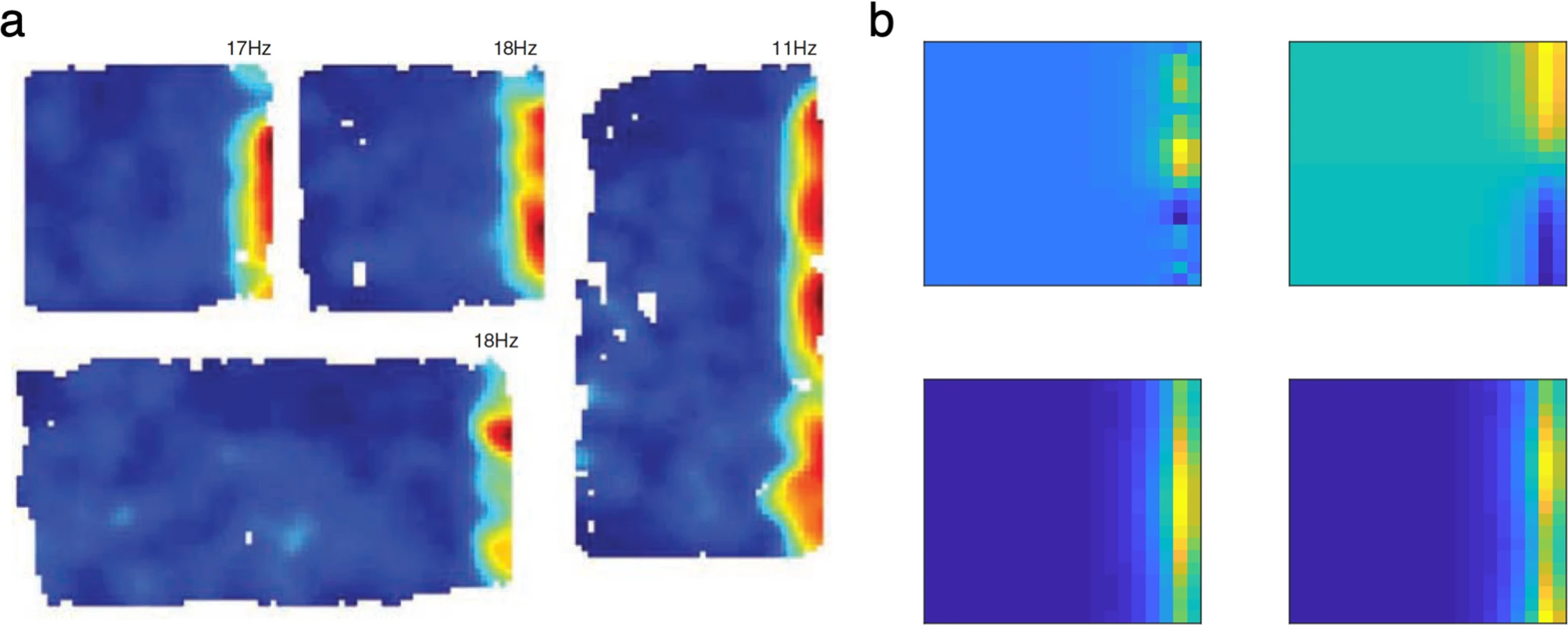 이 맥락에서 entorhinal border cells는 중요한 계산적 단서로 제시된다(Fig. 5a). 이 세포들은 동물이 환경의 경계 근처에 있을 때만 강하게 반응하며, 환경 구조가 바뀌어도 이러한 경계 민감성은 유지된다. 흥미롭게도, DR의 보정 행렬 $M_B$의 열벡터는 border cells의 활성 패턴과 유사한 특성을 보인다(Fig. 5b). 즉, 이들은 기존 DR의 저차원(eigenvector 기반) 표현과 함께 지도(map)를 구성하는 또 다른 기저 함수(basis function)로 해석될 수 있으며, grid cells와 함께 공통된 표현 체계로 통합될 수 있다.