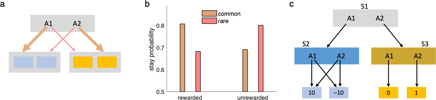 이 접근 방식의 대표적인 예로 저자들은 two-step MDP 과제를 소개한다(Fig. 6a). 이 과제는 심리학과 신경과학에서 모델 기반(model-based) 학습의 존재를 실험적으로 입증하는 데 자주 쓰인다. 첫 번째 상태에서 행동을 선택하면 확률적으로 두 번째 상태 중 하나로 이동하며(0.7의 일반 전이, 0.3의 희귀 전이), 이후 보상을 받게 된다. 실험 참가자는 시간이 지남에 따라 변화하는 보상 확률에 맞춰 정책을 조정해야 하며, 이때 전이 구조에 대한 민감한 행동 변경은 모델 기반 전략의 증거로 해석된다. Linear RL은 확률적 전이를 고려한 확장된 형태로 이 과제에서 실험 참가자와 유사한 전이 민감성 패턴을 재현한다(Fig. 6b).