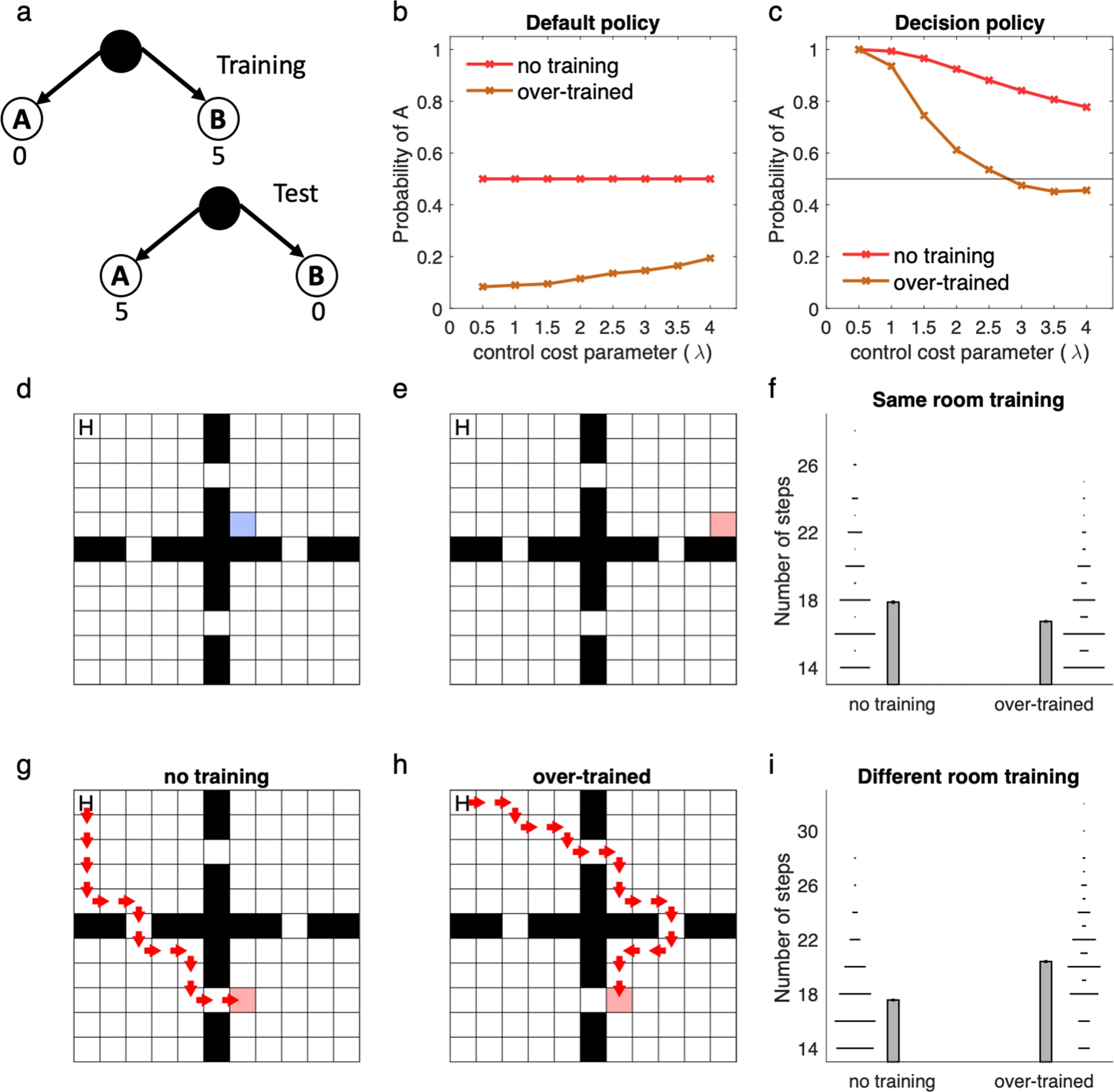 완전히 다른 방으로 이동한 경우 (다른 방으로 이동, Fig. 7g–i): 이때는 이전 정책과 새 정책 간의 겹침이 거의 없어서, default policy의 편향이 새로운 목표를 향한 경로를 왜곡하고, 서브옵티멀(suboptimal)한 경로를 선택함. 이 경우 모델은 습관적 행동의 특징(habitual signature)을 보이는데, 이는 이전에 목표가 있던 방으로 여전히 들어가려는 경향이다.