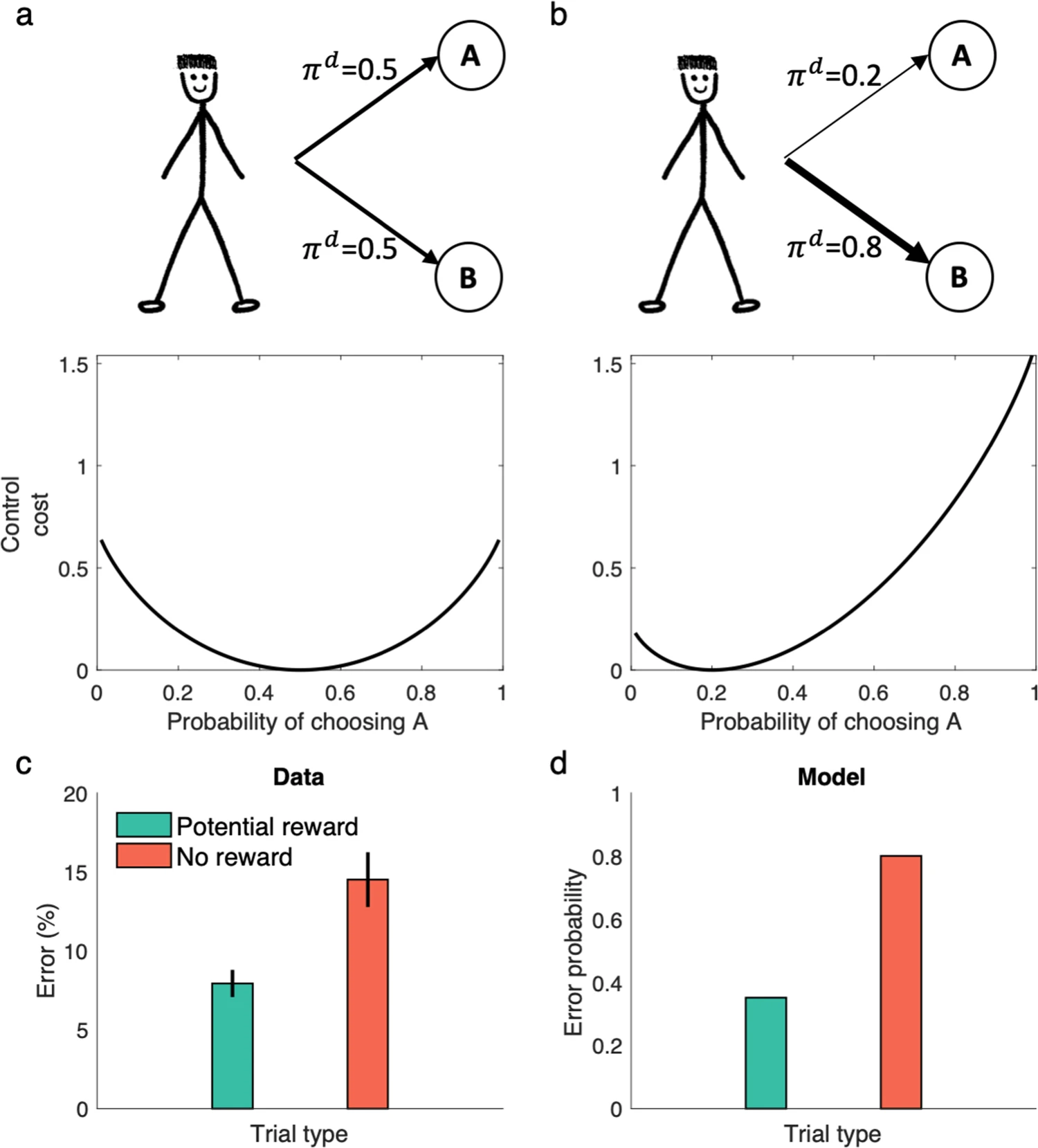 이러한 구조는 기존의 인지 통제를 결정이론적 문제(decision-theoretic problem)로 보려는 연구들과 유사하며, 행동의 보상과 통제 비용 사이의 균형을 통해 행동이 선택된다고 본다. 특히, Figure 8a와 8b에서는 default policy에서 덜 선택되는 행동일수록 control cost가 커지는 양상이 시뮬레이션으로 나타난다. 예컨대 Stroop task에서 ‘색깔 이름 말하기(color naming)’는 default policy에서 낮은 확률을 가지므로 높은 control cost를 가진다. 그 결과, 동일한 보상 조건 하에서는 오류 확률이 증가하게 된다. 이것이 바로 Stroop 효과의 computational한 설명이다.