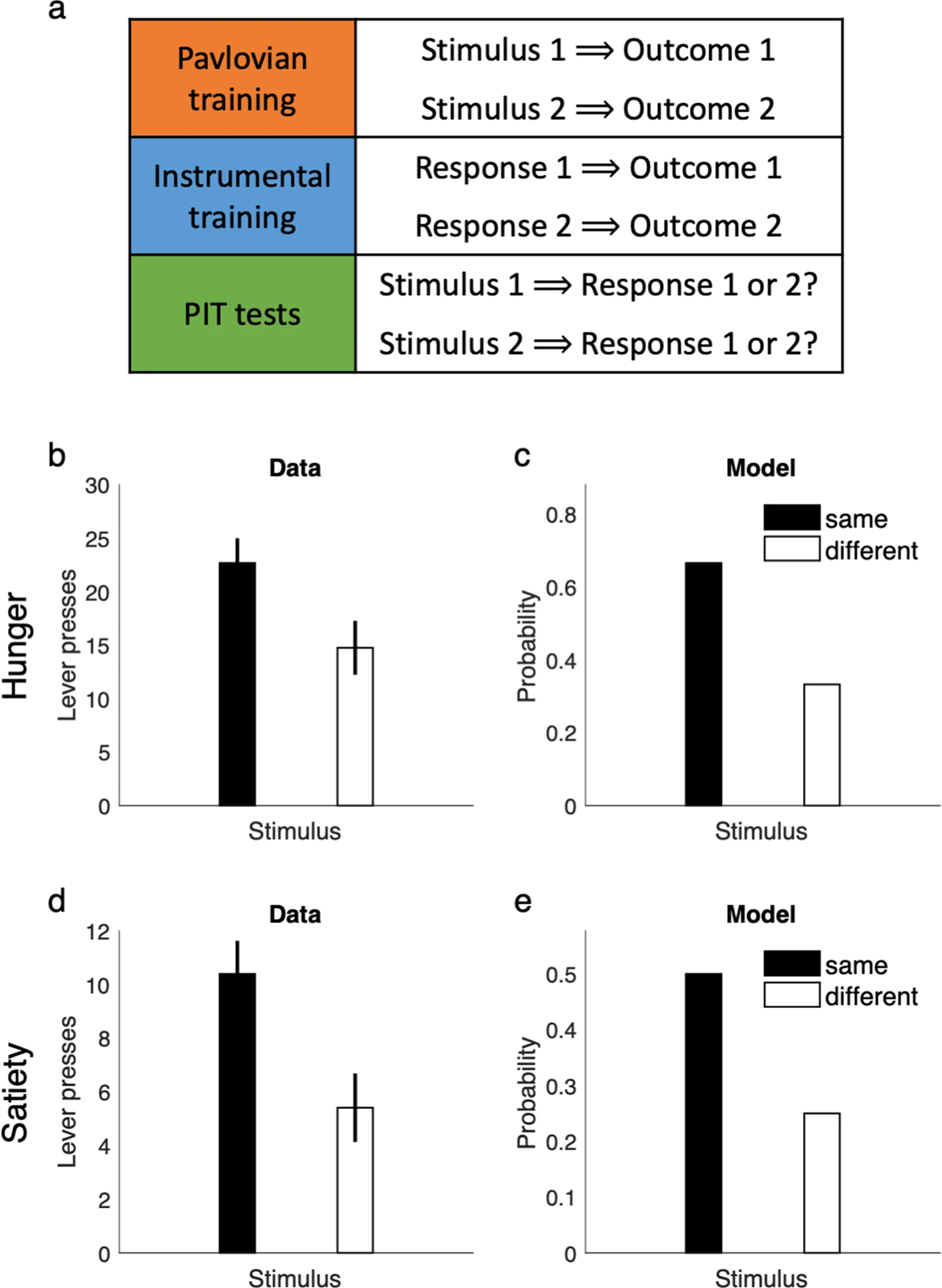 Figure 9b는 이 실험을 실제 동물(쥐)에게 시행했을 때 나타난 결과를 보여준다. 쥐가 배고픈 상태에서 PIT 테스트를 수행하면, 자극이 제시되었을 때 해당 자극과 연합된 보상을 목표로 하는 행동을 유의미하게 더 많이 수행함을 보여준다. 즉, 자극이 도구적 행동 선택에 영향을 미친다는 것이다.