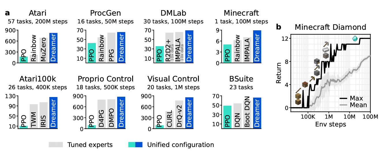특히 DreamerV3는 기존에 인간 데이터나 도메인 특화된 커리큘럼 없이 해결하기 어려웠던 과제인 Minecraft에서 다이아몬드 채취를 인간의 개입 없이 처음으로 성공한 알고리즘이다. 이 과제는 픽셀 기반의 관찰, 드문 보상(sparse reward), 장기 전략이 필요한 개방형 세계에서의 문제로, 강화학습 연구에서 중요한 도전 과제로 여겨져 왔다. DreamerV3는 이처럼 어려운 제어 문제도 별도의 실험 없이 해결함으로써, 강화학습의 실용적인 적용 범위를 크게 확장시킬 수 있음을 보여준다.