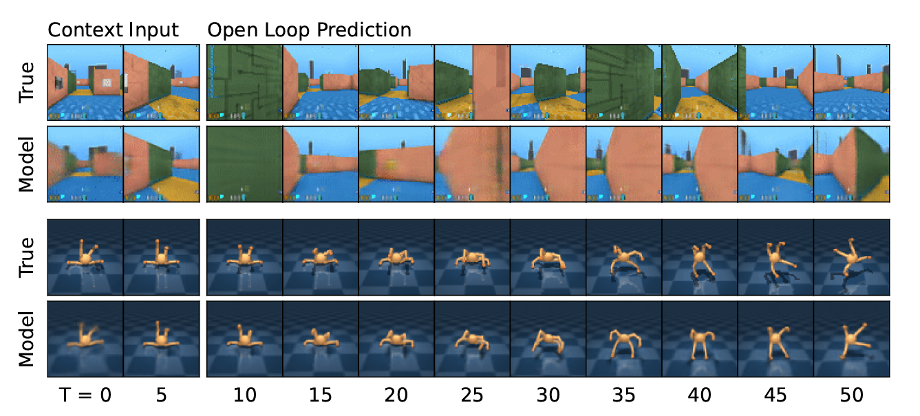 \[\text{Sequence model: } h_t = f_\phi(h_{t-1}, z_{t-1}, a_{t-1}) \\ \text{Encoder: } z_t \sim q_\phi(z_t | h_t, x_t) \\ \text{Dynamics predictor: } \hat{z}_t \sim p_\phi(\hat{z}_t | h_t) \\ \text{Reward predictor: } \hat{r}_t \sim p_\phi(\hat{r}_t | h_t, z_t) \\ \text{Continue predictor: } \hat{c}_t \sim p_\phi(\hat{c}_t | h_t, z_t) \\ \text{Decoder: } \hat{x}_t \sim p_\phi(\hat{x}_t | h_t, z_t)\]Figure 4는 이 모델이 수행하는 장기 비디오 예측의 시각화를 보여준다. encoder와 decoder는 CNN을 통해 이미지 입력을 처리하고, MLP를 사용해 벡터 입력을 처리한다. reward, continue predictor, dynamics predictor는 모두 MLP로 구현되어 있다. 표현 \(z_t\)는 softmax 분포에서 샘플링되며, gradient는 straight-through 방식으로 전달된다.