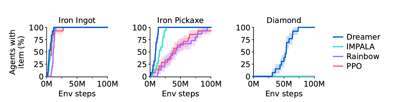 이러한 Dreamer의 가능성을 극단적으로 시험해보기 위해 저자들은 오픈월드 게임인 Minecraft에 Dreamer를 적용하였다. Minecraft는 희소 보상, 긴 시간 지연, 복잡한 탐색, 다양한 환경 변화 등으로 인해 AI 분야에서 ‘다이아몬드 수집’이라는 과제가 대표적인 난제로 간주되어 왔다. 지금까지의 접근 방식은 전문가 데이터나 맞춤형 커리큘럼에 의존해왔으나, Dreamer는 이러한 도움 없이도 ‘처음부터’ 다이아몬드를 수집하는 데 성공한 최초의 알고리즘이다.
