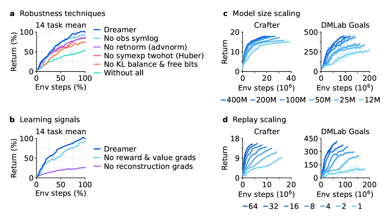 Dreamer는 이를 극복하기 위해 정규화, 균형 조정, 데이터 변환 등 다양한 강인성(robustness) 기법을 도입한다. 이러한 기법은 단순한 이론적 가능성을 넘어서, 실제로 150개 이상의 다양한 과제들에서 일관되게 강력한 성능을 보여주며 모델 크기나 학습 예산이 다르더라도 성능이 안정적으로 향상된다는 패턴을 보여준다. 특히 모델이 클수록 더 적은 상호작용만으로도 더 높은 점수를 얻을 수 있다는 점이 강조된다.