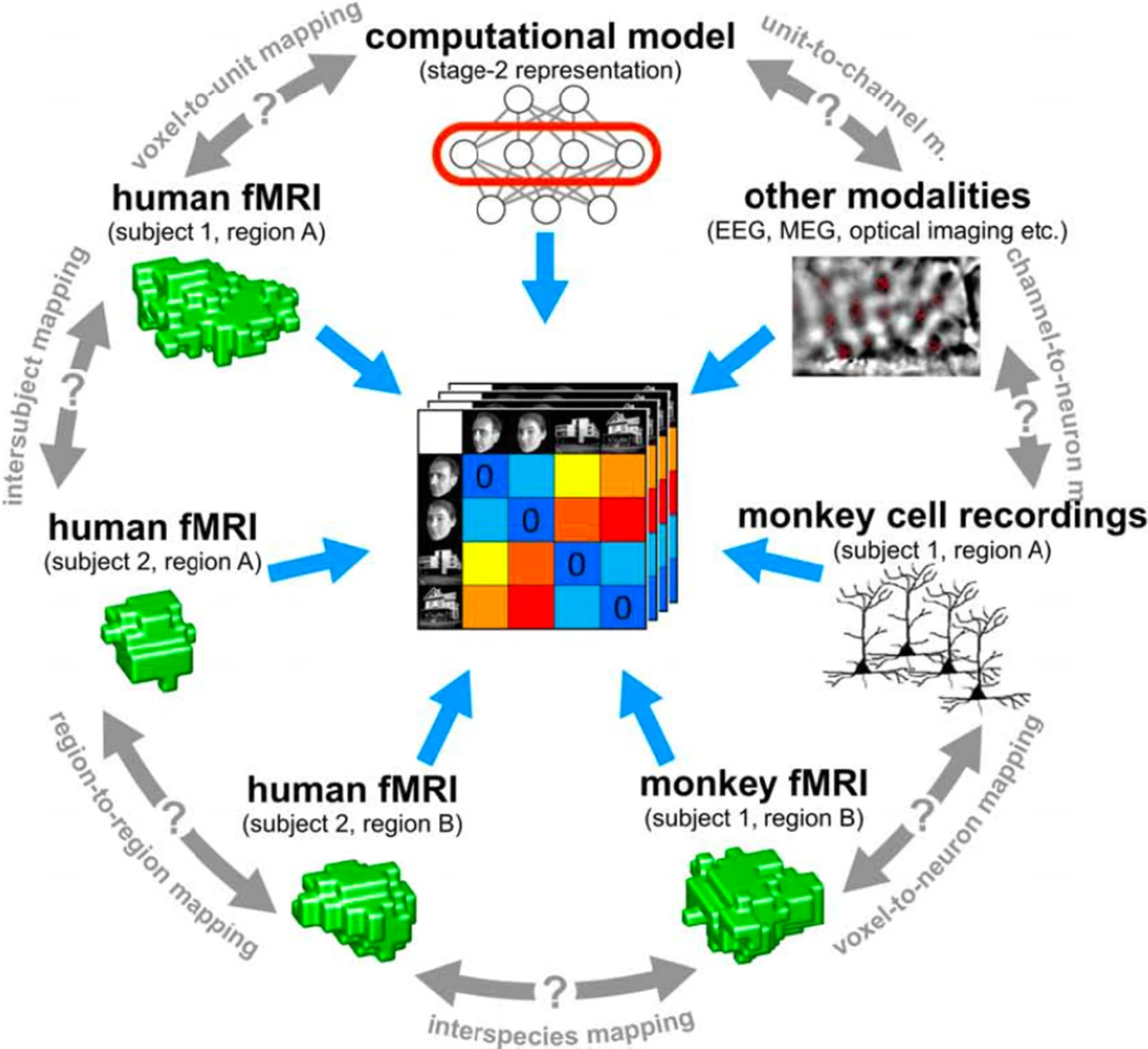 예를 들어, human inferotemporal cortex (IT) 의 fMRI data 로 생성한 RDM 과 monkey IT neurons 의 spike train data 로 생성한 RDM 을 비교할 수 있다. (Figure 2) 연구에 따르면, 두 RDM 은 animal stimuli 에 대해 매우 유사한 representational geometry 를 나타내며, 이는 인간과 원숭이가 IT region 에서 animal image 를 유사한 방식으로 처리하고 있음을 시사한다(Kiani et al., 2007; Kriegeskorte et al., 2008a, b).