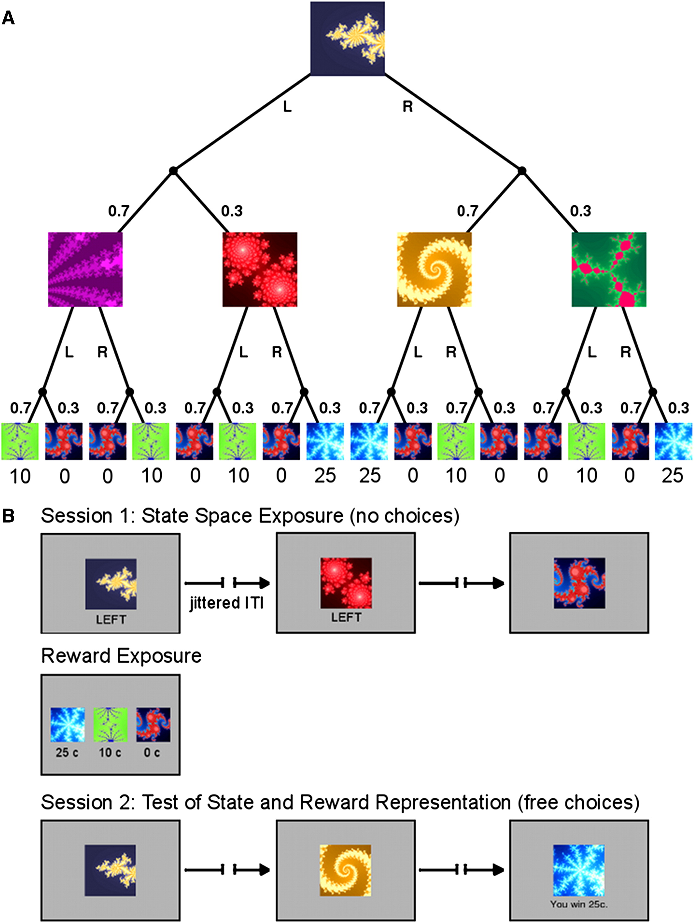 이 연구에서는 피험자들에게 확률적 마르코프 결정 과제를 수행하도록 하였다. 이 과제는 이전의 상태와 행동에 따라 확률적으로 다른 상태로 전이되며, 최종적으로 금전적 보상(0¢, 10¢, 25¢)이 주어지는 구조를 가진다. 실험은 두 개의 세션으로 나누어졌다: