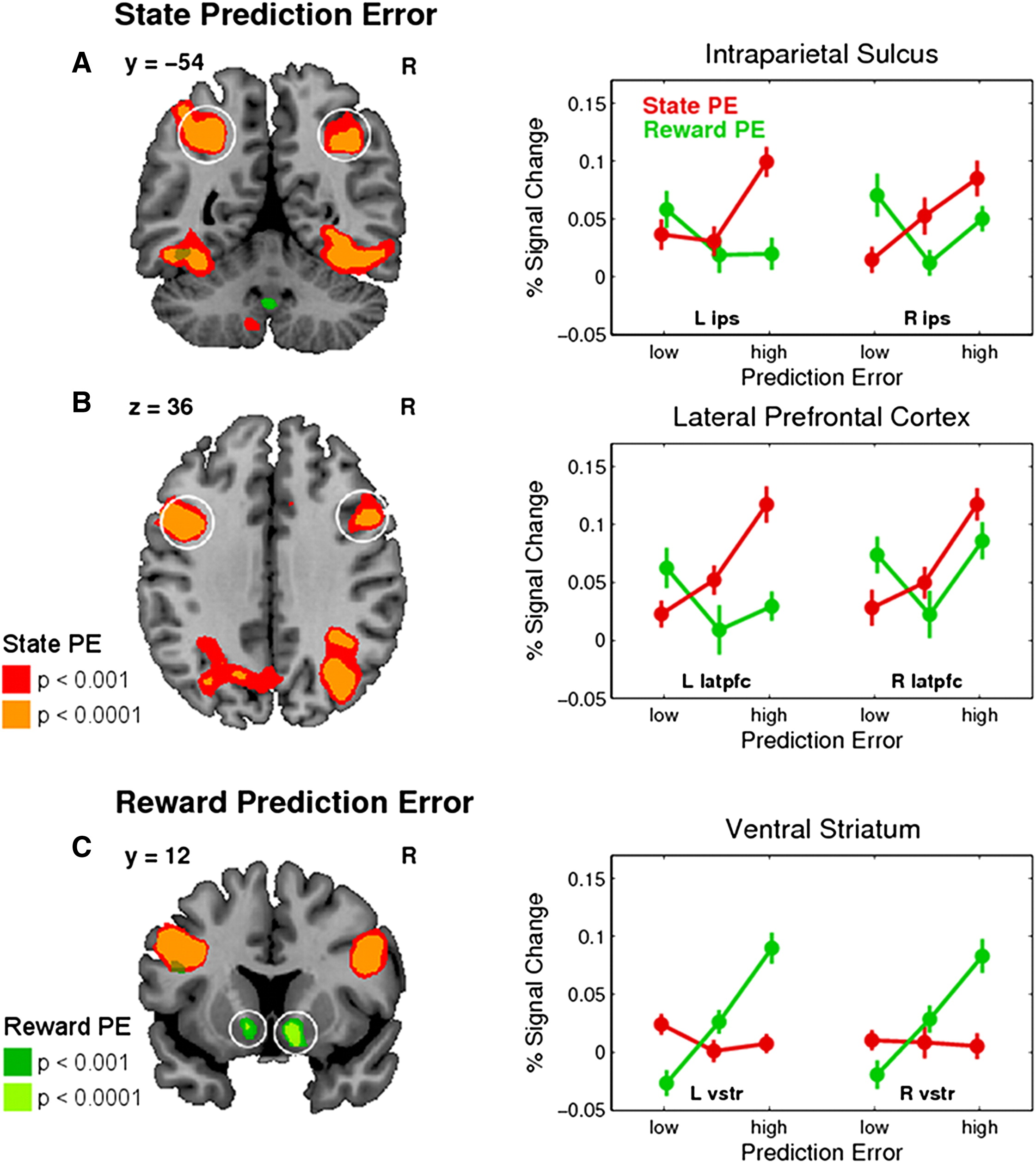 Figure 3A와 3B에서는 SPE와 강한 상관관계를 보이는 신경 영역이 확인되었다. 연구 결과에 따르면, pIPS(posterior intraparietal sulcus)와 latPFC(lateral prefrontal cortex)에서 SPE와 강한 신경 반응이 관찰되었다. 구체적으로,