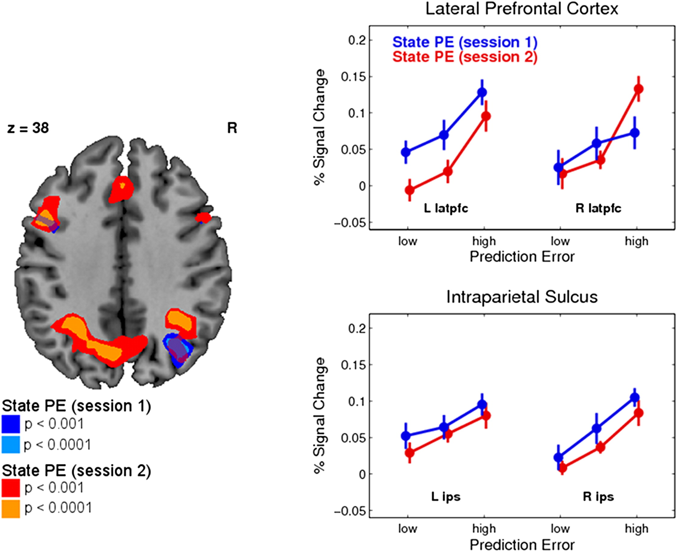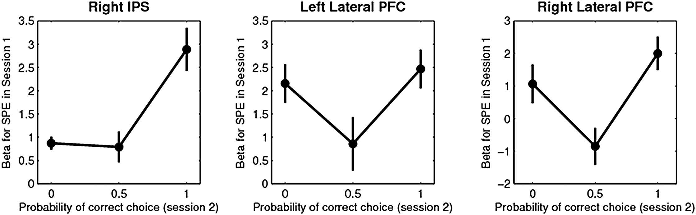 Session 1에서 SPE가 강하게 반영된 영역을 대상으로 신경 활동을 분석을 진행하였다. 이전 분석에서 유의미한 신경 활동을 보였던 두정엽 pIPS 및 양측(latPFC)에서 신경 신호를 추출해서 각 피험자의 신경 활동 값을 그룹 피크 복셀(peak voxel)을 중심으로 반경 10mm 구체적 영역(spherical volume)에서 평균 내어 계산하였다.