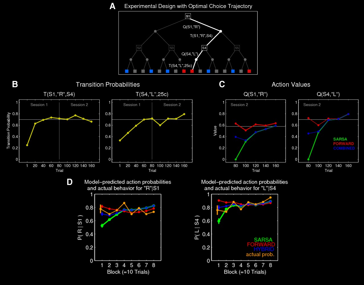 모델 기반 학습(Model-Based Learning)은 환경의 상태 전이(state transition)와 보상 구조를 학습하는 반면, 모델 자유 학습(Model-Free Learning)은 보상만을 기반으로 학습하기 때문에 Session 1(보상 없음) 동안 모델 자유 학습은 아무런 학습도 수행할 수 없다. 따라서, Session 2의 첫 선택이 확률적 우연이 아니라 더 나은 선택을 반영한다면, 이는 모델 기반 학습의 영향을 시사하는 증거가 된다. 실험 결과, 18명의 참가자 중 13명이 최적의 선택인 Right(R) 를 선택하였고(그림 A 참고), 5명만이 Left(L) 를 선택하였다. 이는 단순 확률보다 유의미하게 높은 비율이며, p < 0.05 (sign-test, one-tailed)에서 통계적으로 유의미한 결과였다. 따라서 참가자들의 선택이 모델 자유 학습만으로는 설명될 수 없으며, 모델 기반 학습을 통해 환경의 상태 전이 정보를 학습하고 이를 활용했음을 시사한다.