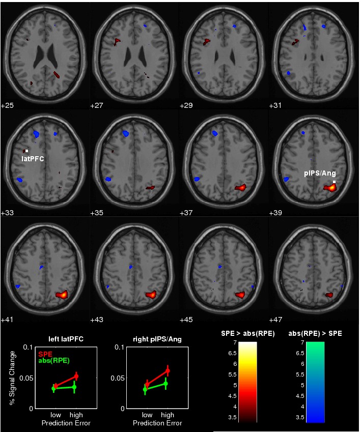연구진은 보상 예측 오류(RPE)의 절대값(abs(RPE))을 사용하여, 단순한 놀람(surprise) 신호와 SPE 신호가 동일한지 분석하였다. abs(RPE) 신호는 두정엽 피질(IPS) 전방(anterior IPS)에서 강한 신경 활성화를 유발하였다. (p < 0.001, uncorrected) 그러나, SPE와 강한 상관관계를 보였던 후방 IPS(posterior IPS)와는 다른 위치에서 abs(RPE) 신호가 나타났다. 즉, 놀람 신호(surprise)와 SPE 신호는 뇌의 서로 다른 영역에서 반영되었다.