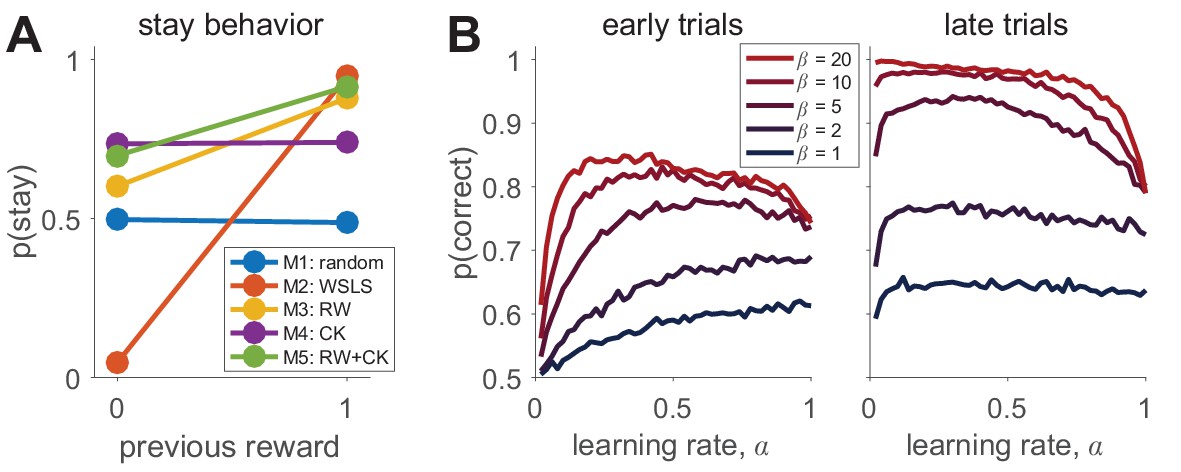 예를 들어, 확률적 강화 학습(probabilistic reinforcement learning)에서 Rescorla-Wagner 모델(Model 3, Equation 3)을 적용할 경우 \(\alpha\) (학습률, learning rate)는 학습 속도 및 안정적인 행동 여부에 영향을 주며, \(\beta\) (inverse temperature)는 선택이 얼마나 결정적(deterministic)인지 또는 랜덤(random)한지를 조절한다.