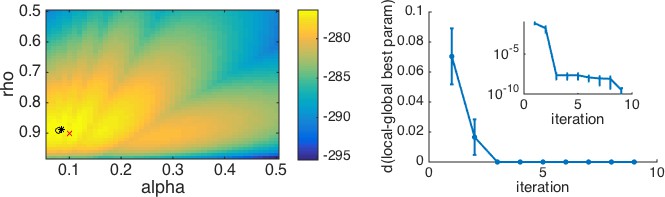 Collins & Frank (2012)의 모델은 강화 학습(reinforcement learning)과 작업 기억(working memory)을 혼합한 모델로, 가장 단순한 버전에서는 두 개의 주요 파라미터를 가진다. \(\kappa\): 작업 기억(working memory)의 영향력을 나타내는 파라미터 \(\alpha\): 강화 학습(learning rate, 학습률)을 나타내는 파라미터 2가지이다. 이 모델을 특정 실험과 결합하여 최적화를 수행하면, 로그-우도 함수가 여러 개의 지역 최대 값을 가지는 복잡한 표면(log-likelihood surface)을 형성한다. 즉, 최적화 알고리즘이 어디에서 시작하느냐에 따라 서로 다른 최적해에 수렴할 수 있다. figure 2 (왼쪽 그래프)를 보면, 이 모델의 로그-우도 표면이 여러 개의 지역 최대를 포함하고 있음을 확인할 수 있다.