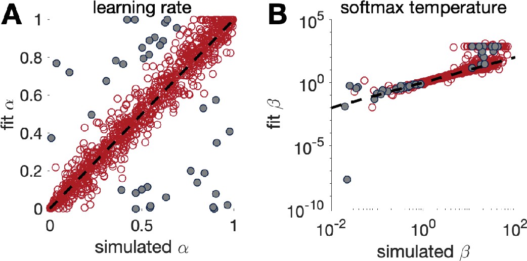 소프트맥스 파라미터 \(\beta\)의 경우, \(1 < \beta < 10\) 범위에서는 매우 정확하게 복원되나 \(\beta\) 값이 1보다 작거나 10보다 크면 복원 성능이 떨어졌다. 즉, 극단적으로 낮거나 높은 \(\beta\) 값에서는 모델이 올바르게 파라미터를 복원하지 못할 가능성이 높다고 할 수 있다. 학습률 \(\alpha\) 의 복원 성능의 경워, 특정 상황에서 학습률 \(\alpha\) 의 복원 성능이 낮아지는 경우가 관찰되었는데, 복원된 \(\alpha\) 값과 실제 시뮬레이션된 값 사이의 오차 \(\vert \alpha_{\text{sim}} - \alpha_{\text{fit}} \vert > 0.25\) 가 되는 경우를 회색 점(grey dots)으로 표시하였다.