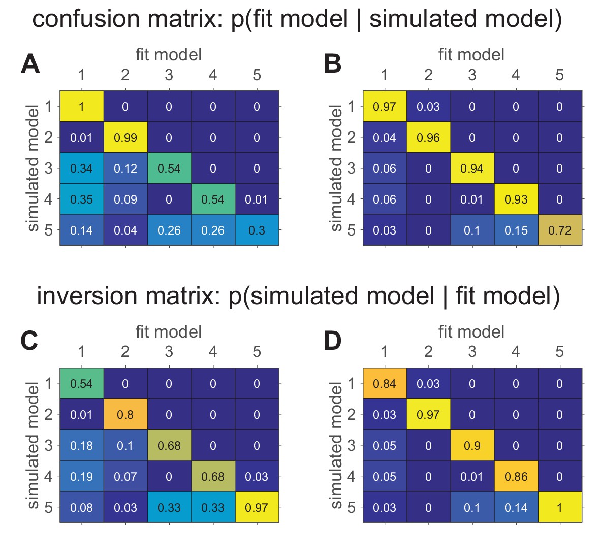 혼동 행렬은 모델 복원 성능을 평가하는 데 유용하지만, 실제 실험 데이터를 분석할 때, 특정 모델이 가장 잘 맞았다고 해서 반드시 그 모델이 진짜 생성 모델이라는 보장은 없다. 이 문제를 해결하기 위해, 베이즈 정리(Bayes’ Rule)를 이용해 역행렬을 계산할 수 있다. figure 4의 혼동 행렬에서, Model 1의 혼동 행렬의 대각선 값이 1.00으로, 모델 1에서 생성된 데이터는 다시 모델 1에서 가장 잘 피팅된다. 그러나, figure 4의 역행렬에서 Model 1이 데이터 생성 모델일 확률은 54%로 낮은데, 이는 Model 1이 가장 잘 맞는다고 해도, 실제 데이터가 Model 1에서 생성되었을 확률이 높지 않다는 것을 의미한다.