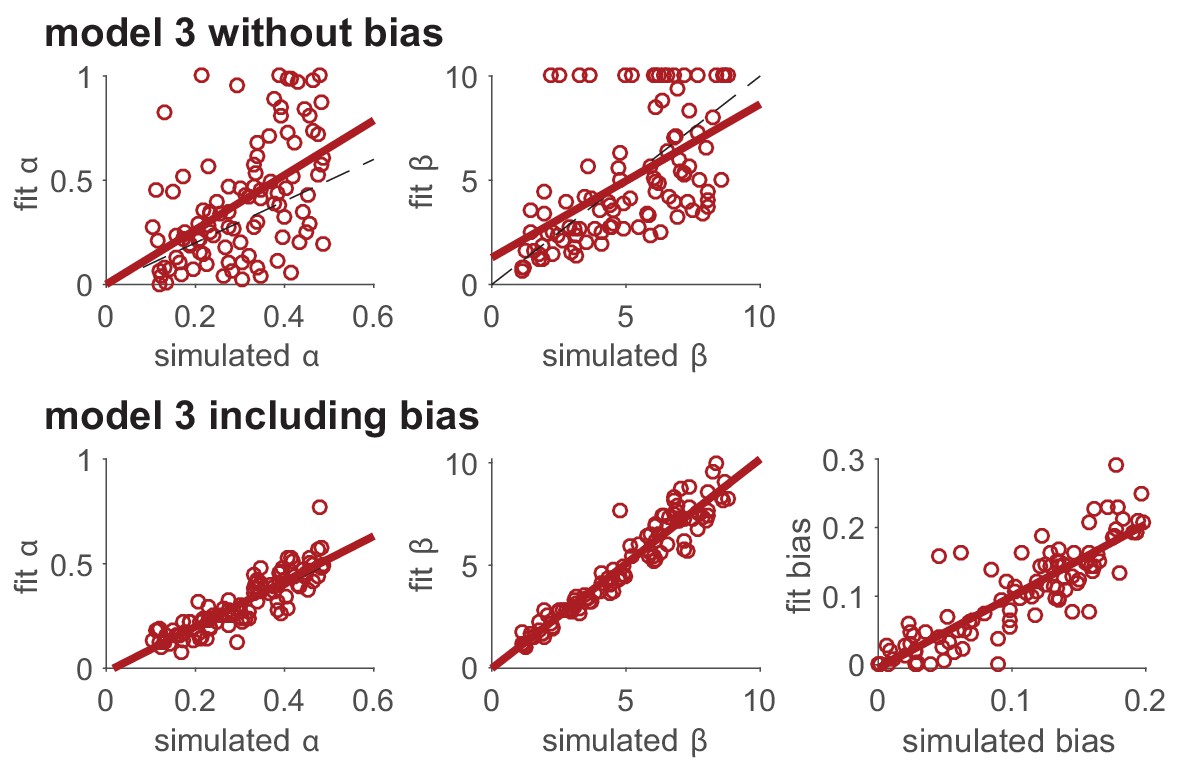 연구진은 Rescorla-Wagner 학습 모델(Model 3)에 “선택 편향(side bias)”을 추가했을 때, 파라미터 복원 성능이 향상되는지 평가하는 실험을 수행하였다. 일반적으로 Rescorla-Wagner 모델에서 선택 확률은 다음과 같이 정의된다.
