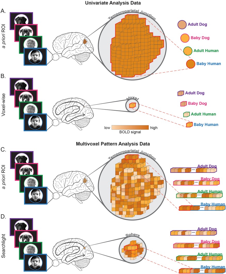 신경영상 연구에서 중요한 목표 중 하나는 어떤 신경 반응이 뇌의 어느 위치에서 발생하는지를 파악하는 것이다. 이는 크게 두 가지 방법을 통해 수행될 수 있다. 영역 기반 분석 (Region of Interest, ROI-based analysis, 연구자가 사전에 특정 뇌 영역을 정의한 후, 해당 영역에서 신경 활성 패턴을 분석하는 방법이다.), 점별 분석 (Point-by-point analysis, 연구자가 사전 정의한 특정 영역이 아니라, 뇌 전체에서 개별 복셀(voxel)을 기준으로 분석하는 방법이다. 단변량 분석에서는 복셀 단위(voxel-wise) 로 분석하며, MVPA에서는 서치라이트 분석(searchlight analysis) 을 사용한다.)이다.
