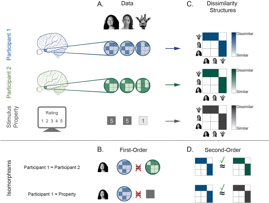같은 방식으로, 특정 뇌 영역이 어떤 속성을 인코딩한다면, 해당 속성과 신경 반응 크기 간의 직접적인 상관관계는 보이지 않을 수 있으나 자극들 간의 유사성(예: 두 사람의 얼굴은 서로 유사하지만, 기린의 얼굴과는 다름)과 신경 반응 패턴의 유사성이 일치한다면, 그 뇌 영역이 해당 속성을 처리하고 있을 가능성이 높다고 볼 수 있다. RSA는 이러한 원리를 활용하여, 신경 반응 패턴 간의 유사성을 비교함으로써 자극 간의 상대적 관계를 분석한다. 즉, 두 개의 서로 다른 사람이 동일한 자극을 보았을 때, 개별 신경 반응 패턴 자체는 다를 수 있지만(Figure 2B), 그 신경 반응들 간의 관계는 일정하게 유지될 수 있다.(Figure 2D) 이와 같이 RSA는 개인 간 비교, 다른 측정 방식 간 비교, 모델과 신경 반응 간 비교 등을 가능하게 한다.