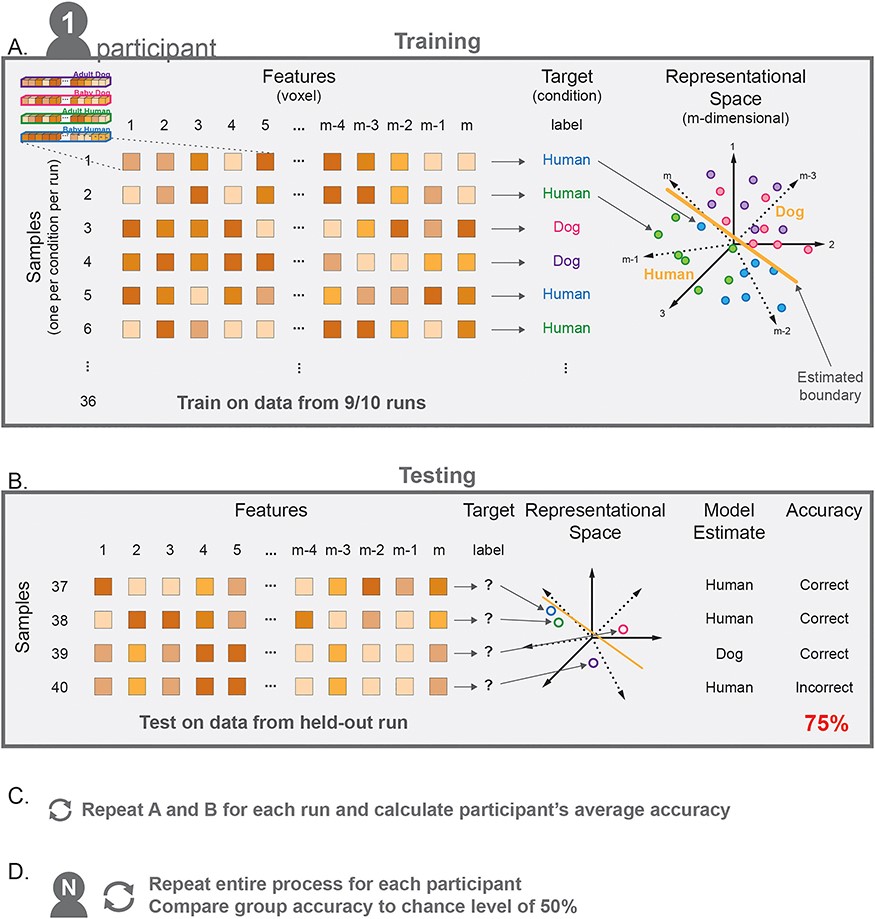 참가자가 현재 어떤 생각을 하고 있는지 또는 어떤 자극에 주의를 기울이고 있는지를 해독하는 과정이다. 만약 특정 뇌 영역에서 이 정보를 성공적으로 디코딩할 수 있다면, 해당 영역이 인간과 개의 얼굴을 근본적으로 다르게 인코딩하고 있거나, 특정 공변량(covariate)이 그 차이에 기여하고 있음을 의미할 수 있다.