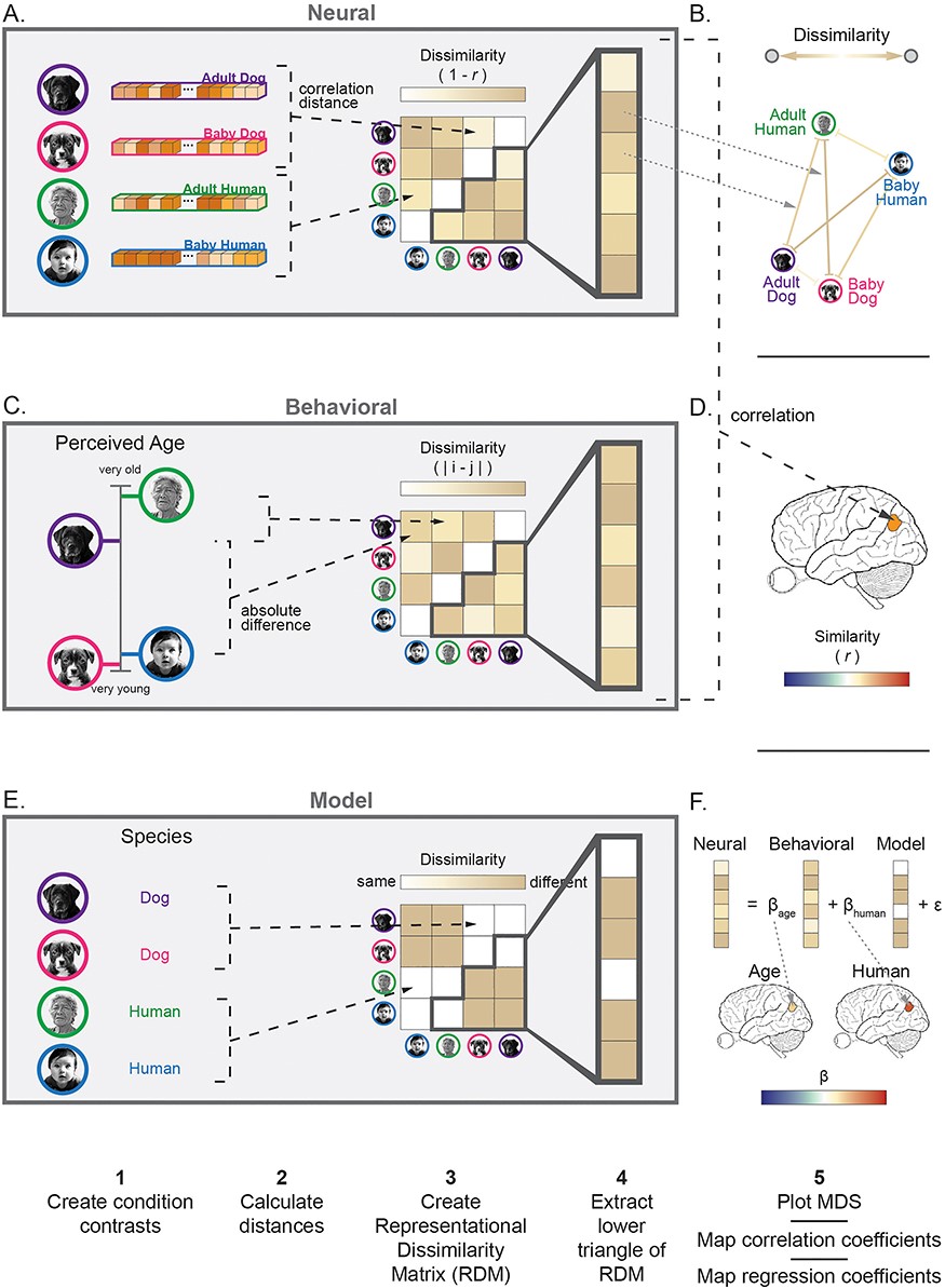 RSA에서 가장 중요한 도구는 표상 비유사성 행렬(Representational Dissimilarity Matrix, RDM) 이다. 이는 각 자극이 유발한 신경 반응 패턴 간의 유사성을 수량화한 행렬이다. 즉, 특정 뇌 영역이 두 개의 자극을 얼마나 다르게 처리하는지를 측정하는 역할을 한다.(Figure 2C) 신경 RDM 외에도 여러 종류의 RDM을 만들 수 있다. 예를 들어,