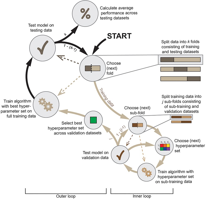가장 단순한 하이퍼파라미터 튜닝 방법은 사용자가 설정한 여러 하이퍼파라미터 값들을 조합하여 반복적으로 모델을 훈련시키고 테스트하여 최적의 조합을 찾는 grid search이다.그러나 하이퍼파라미터 튜닝 과정이 검증 데이터(test data)에 영향을 미치지 않도록 하기 위해 nested cross validation을 사용하여 훈련 데이터를 다시 훈련용 데이터(sub-training set)와 검증 데이터(validation set)로 나누고, 다양한 하이퍼파라미터 값을 적용하여 최적의 조합을 찾은 후 최종 모델 학습에 활용한다.