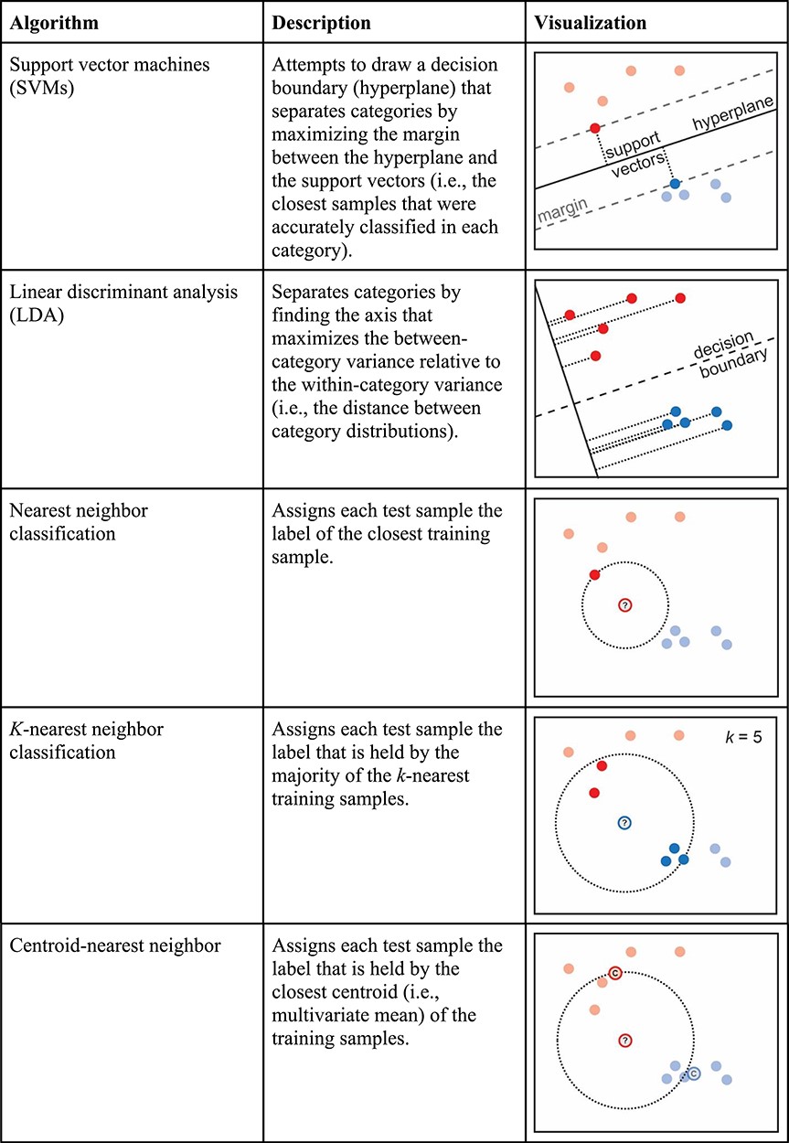 반면, SVM은 각 조건을 구별하는 최적의 초평면(hyperplane)을 찾는 방식으로 작동한다. SVM의 특징은 결정 경계와 가장 가까운 샘플들(서포트 벡터, support vectors)만을 고려하여 초평면을 결정한다는 점이다. 즉, 범주 간 거리를 최대화하는 방식으로 학습되며, 결정 경계에서 멀리 떨어진 샘플들은 모델 학습에 영향을 미치지 않는다. SVM의 장점은 소규모 데이터셋에서도 비교적 강건한 성능을 발휘하며, 이상치의 영향을 덜 받는다는 점이지만, 다중 클래스 분류(multi-class classification)에서는 추가적인 조정이 필요하며, 선형적으로 구분되지 않는 경우에는 커널(kernel) 기법을 적용해야 한다. 그 외에도 최근접 이웃 분류(Nearest Neighbor Classification) 방식이 있으며, 이는 새로운 샘플이 훈련 데이터에서 가장 가까운 샘플과 동일한 범주에 속한다고 가정하는 방법이다.