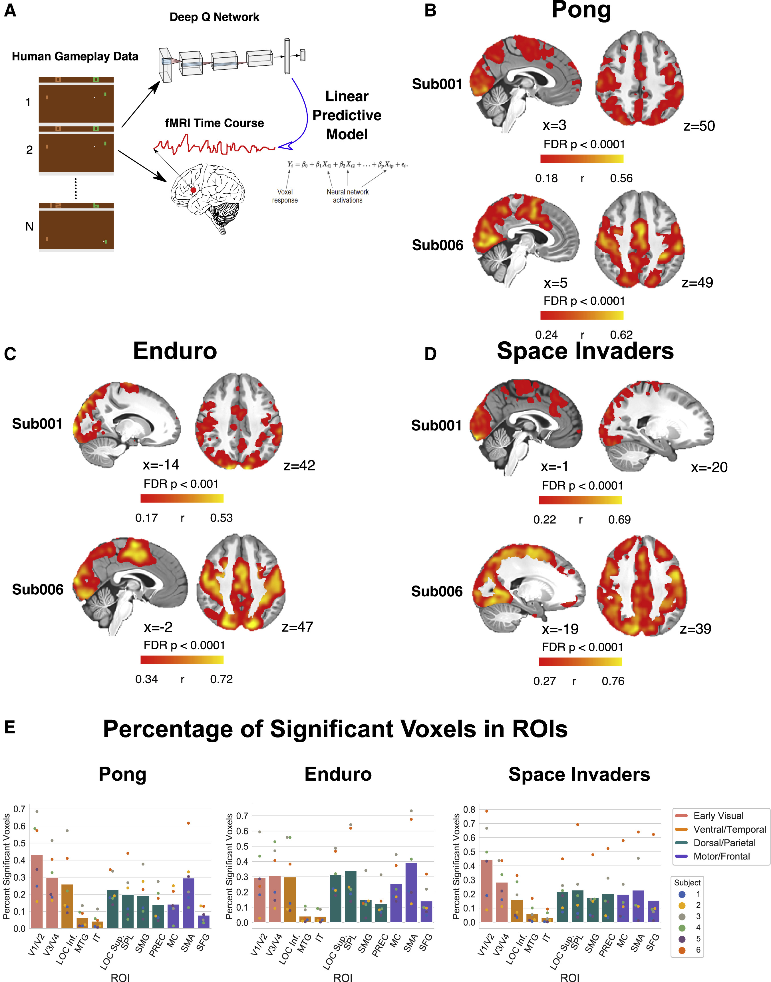 연구자들은 6명이 실험자의 게임 플레이 데이터를 DQN에 통과시킨 후, 각 4개의 hidden layer에서 PCA를 수행, 100개의 PC를 추출했다. 이 PC를 가지고 ridge regression을 수행하여 6명의 실험자의 fMRI 데이터와 대조, 각 voxel의 반응도를 예측하는 모델을 구축했다. 예측도는 원래 fMRI데이터와 대조하여 pearson correlation으로 평가되었다. 그렇게 분석을 한 결과가 위와 같은데, 결과가 꽤 인상적이다. 각 게임마다 활성화되는 부위가 조금씩 다른데, 상관계수 r가 높은 것이 유의미하게 드러나는 것을 볼 수 있다. B-D까지의 그림을 보면 공통적으로 visual cortex - posterior parietal cortex까지의 활성이 두드러지는 것을 알 수 있다.