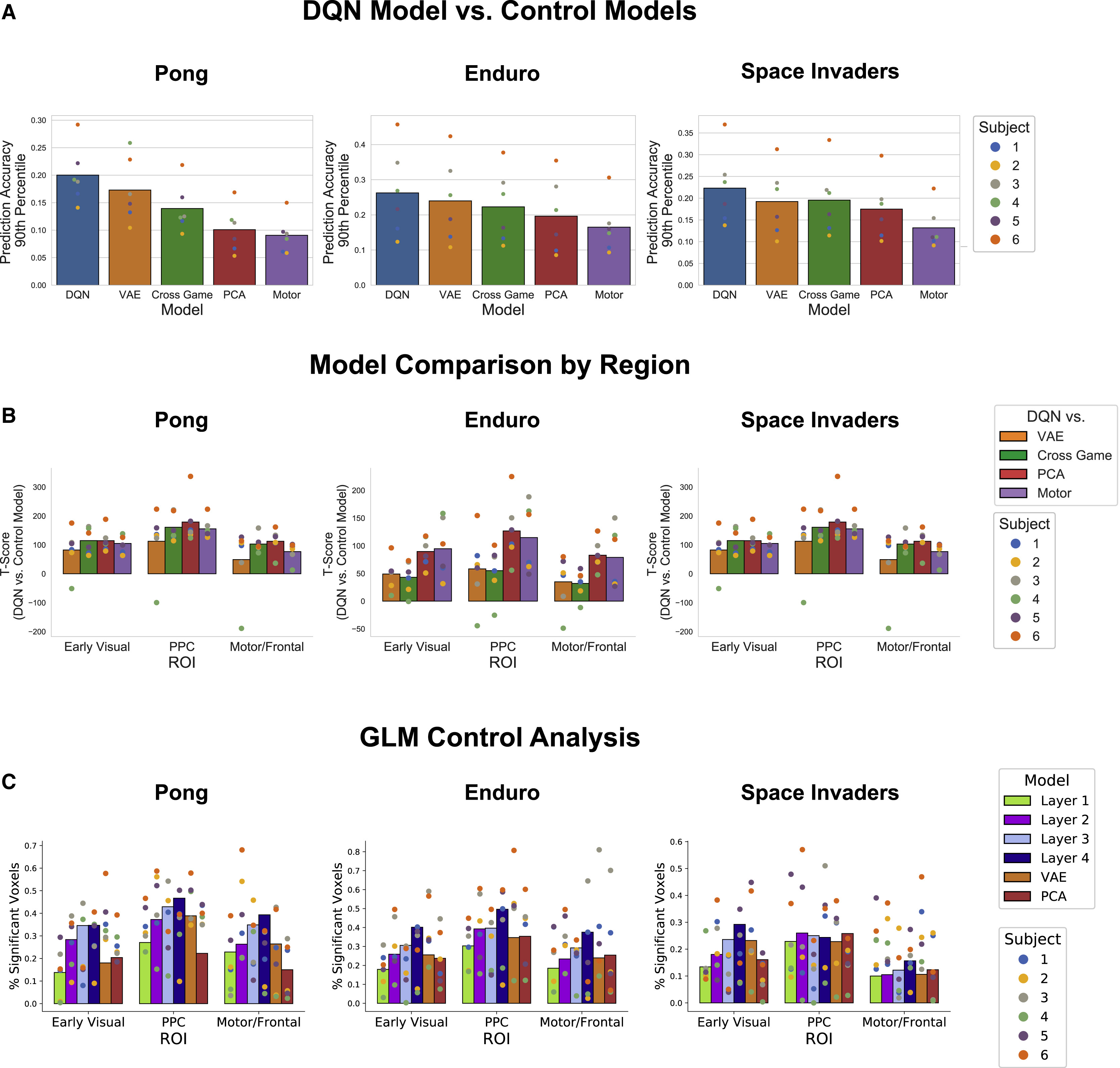 여기서부터는 DQN과 다양한 모델을 비교하면서, DQN이 얼마나 뇌의 신경 활동을 잘 설명하는지 평가해 볼 것이다. 이전과 같이 각 모델을 hidden layer에서 추출된 representation을 linear model에 통과시켜서 fMRI신호를 예측하는 방식을 사용하였다. 그림 A를 보면 DQN의 hidden layer가 VAE, Cross game model, PCA등과 비교하였을 때 예측력이 더 좋았다. 재미있는 점은 이 DQN은 다른 게임으로 학습된 DQN이라는 점이다. 즉 이 게임에 편향되어 학습한 것이 아니라 전체적인 전략을 학습한 것이라고 이해할 수 있다.