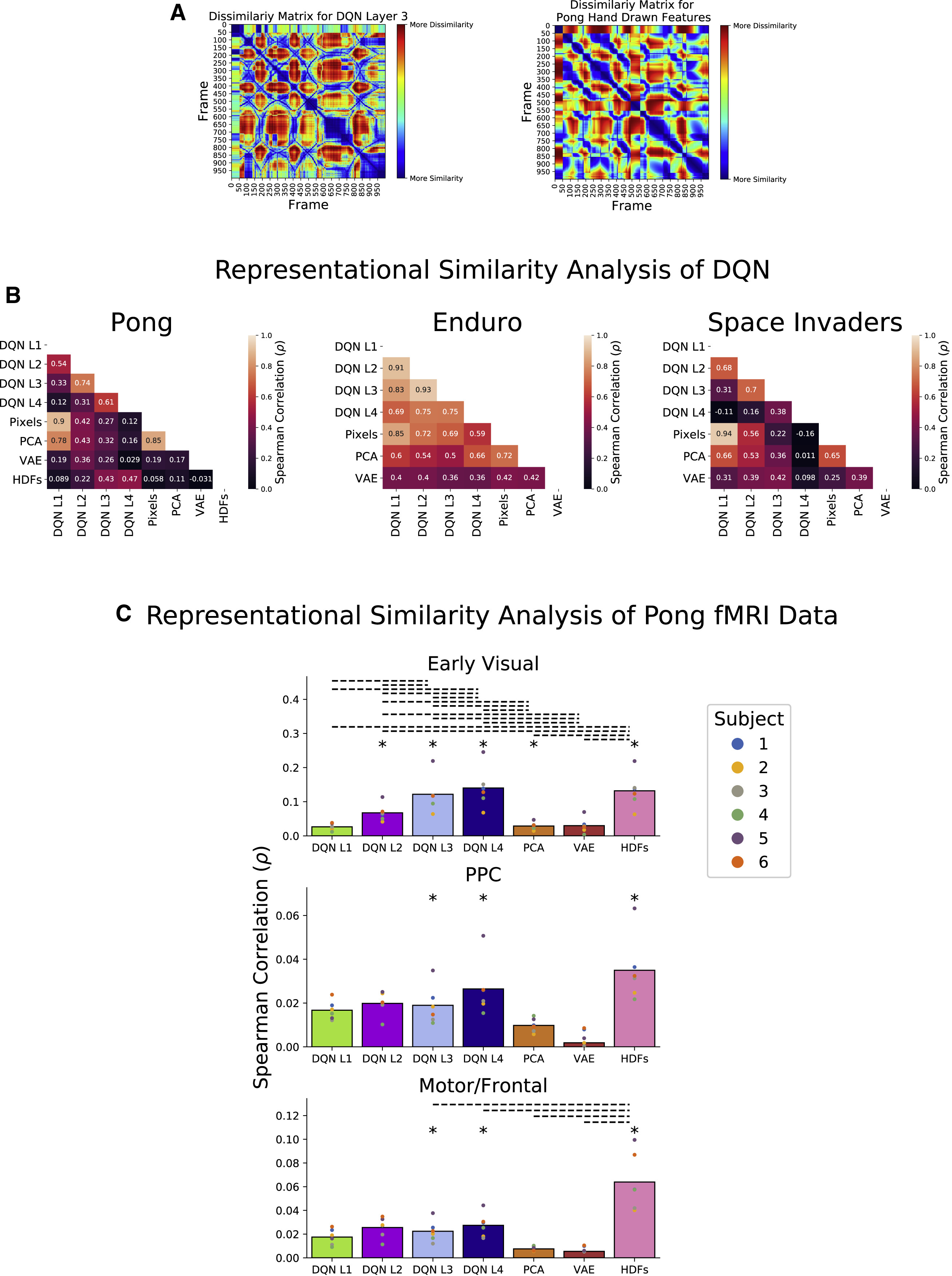 그림 B는 DQN의 4개 layer, hand-drawn feature, 그리고 다른 여타 모델의 내부 representation의 DSM의 상관관계(spearman)를 보여준다. 나는 여기서 왜 연구자들이 representation의 상관관계를 측정할 때 pearson correlation을 쓰지 않고 spearman rho를 사용했는지 궁금했는데, 아마 내부 representation의 경우 단순한 linear한 관계가 아닐뿐더러, 고차원적 맵핑을 비교하는 것이기 때문에 비선형성 데이터 분석에 부적합한 pearson을 배제한 것이 아닐까 하는 생각이다. 또한 dissimiarlity matrix의 경우 데이터의 상대적인 순서가 의미를 가지는 경우가 있을 수 있기 때문에 spearman 분석이 더 적합하다고 판단했던 것 같다.