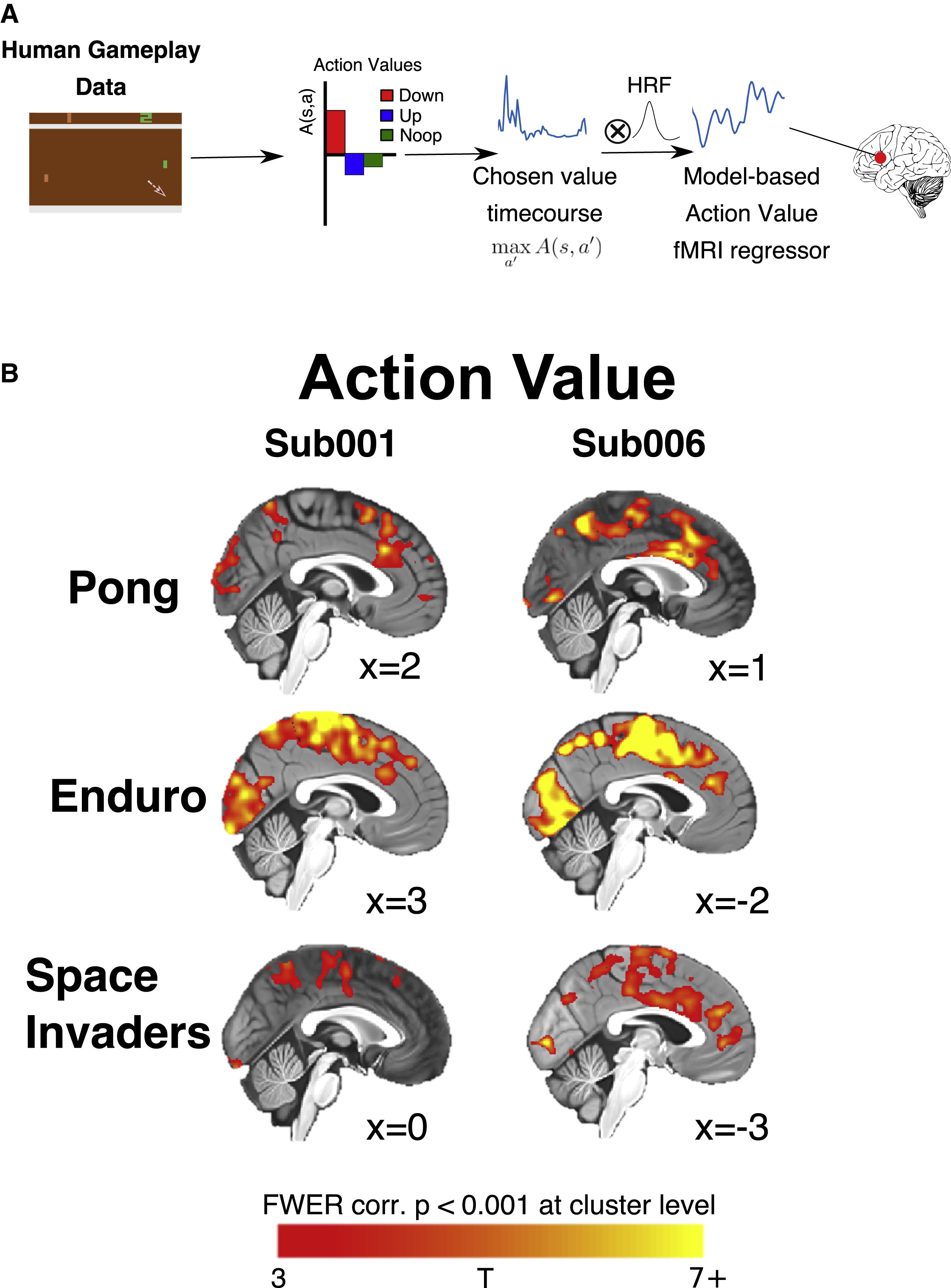 DQN의 hidden layer는 state-space를 이용, Q value를 최종 output으로 하여 action evaluation을 진행한다. 이러한 action evaluation이 뇌에서 비슷한 과정이 일어나는지 알아보기 위해 저자들은 DQN의 Q-value를 fMRI 분석에 적용해 보기로 했다. figure 6의 첫 번째 그림은 연구에 사용된 분석을 나타낸 그림이다. DQN의 Q-value를 10hz로 다운샘플링한 다음, Hemodynamic function과 Conv연산을 수행하여, 이를 GLM에 적용하였다. 이 신호를 이용해서 fMRI 반응 예측을 수행했다.