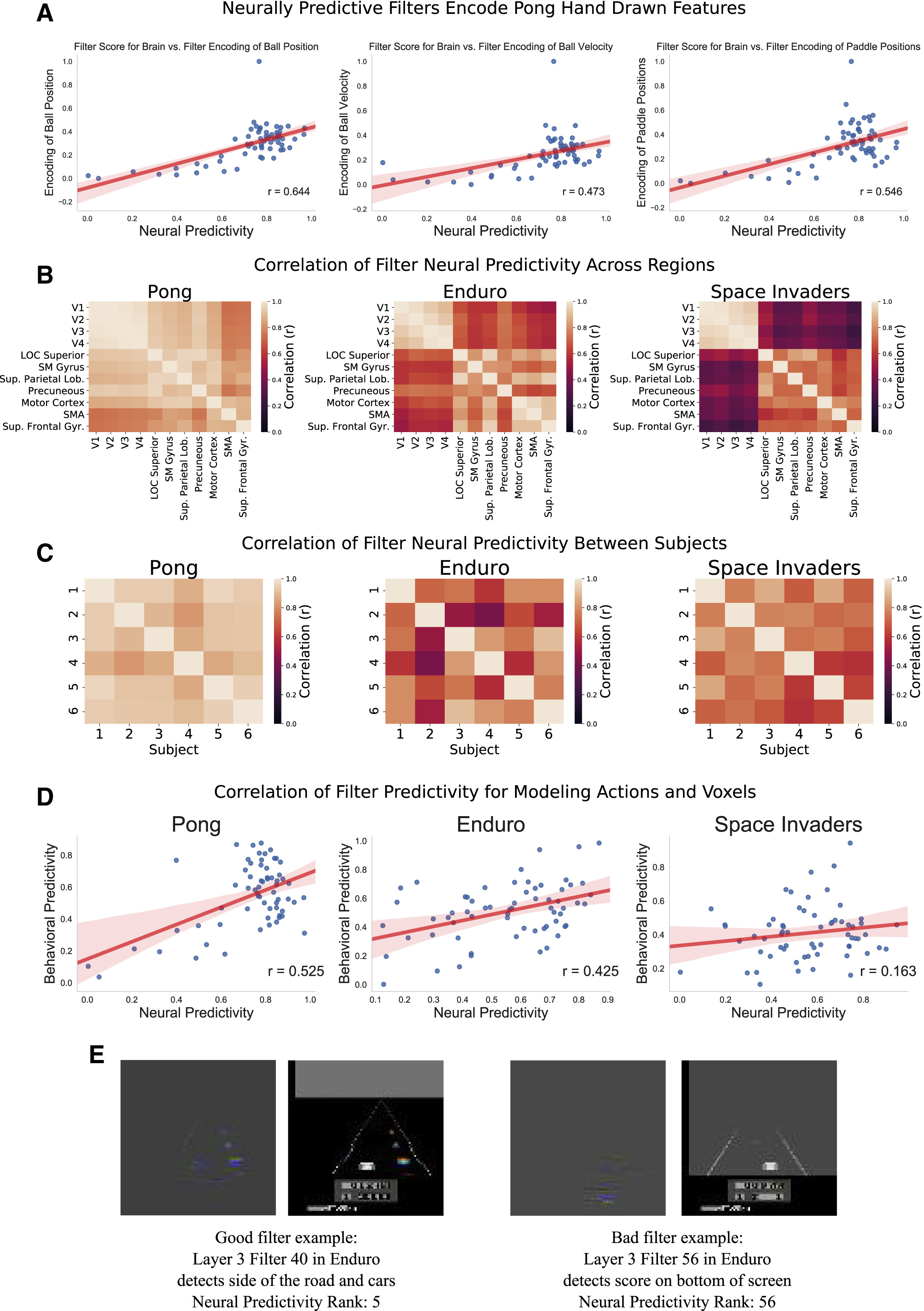 figure 7의 첫 번째 그림은 pong의 hand drawn feature과 상관 관계를 나타내었으며, 각각 공의 위치, 속도, paddle position과의 관계를 나타낸다. 그 결과 위 3가지 feature와 높은 상관관계를 갖는 필터가 발견되었다. 두 번째 그림은 region에 따른 nerual predictivity score의 상관관계를 나타낸 것이다. pong에서는 대체로 모든 roi에서 유사한 필터를 선호하는 경향성이 관찰되었다. 하지만 enduro, space invader에서는 서로 다른 roi는 서로 다른 필터와 높은 상관관계를 가지는 것으로 분석되었다. 또한 이러한 경향성은 모든 참가자 간에서 일관성 있게 유지되는 모습을 보였다.