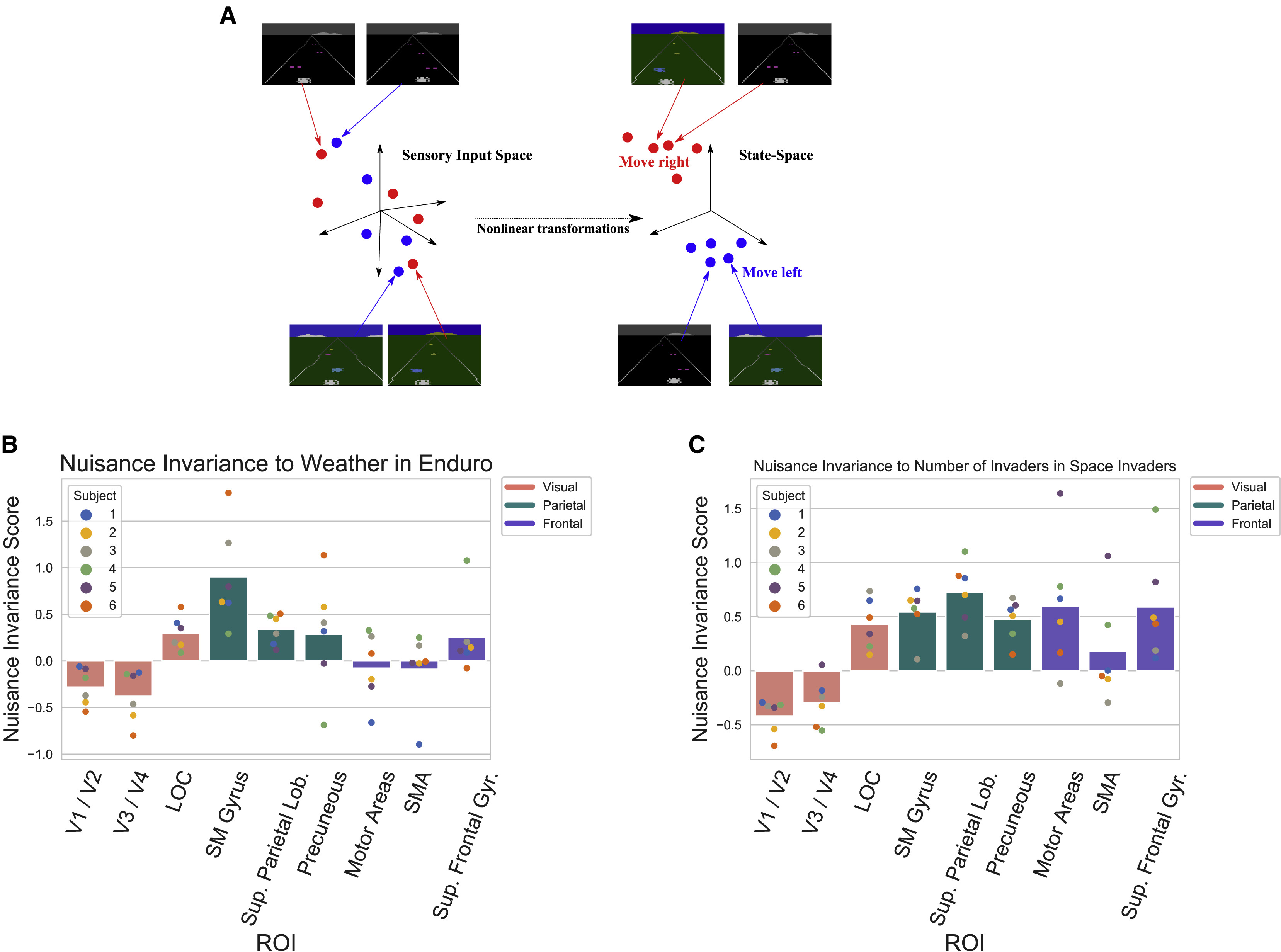 Figure 8. Representations become more insensitive to nuisances in posterior parietal cortex